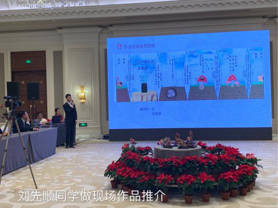典礼上,美术学院李婧杰老师作了现场发言,对平面设计专业服务地方的教学实践进行了推介,并向现场企事业单位发出了合作邀请。2016级平面设计班刘先顺同学代表美术学院参赛选手作了作品推介。