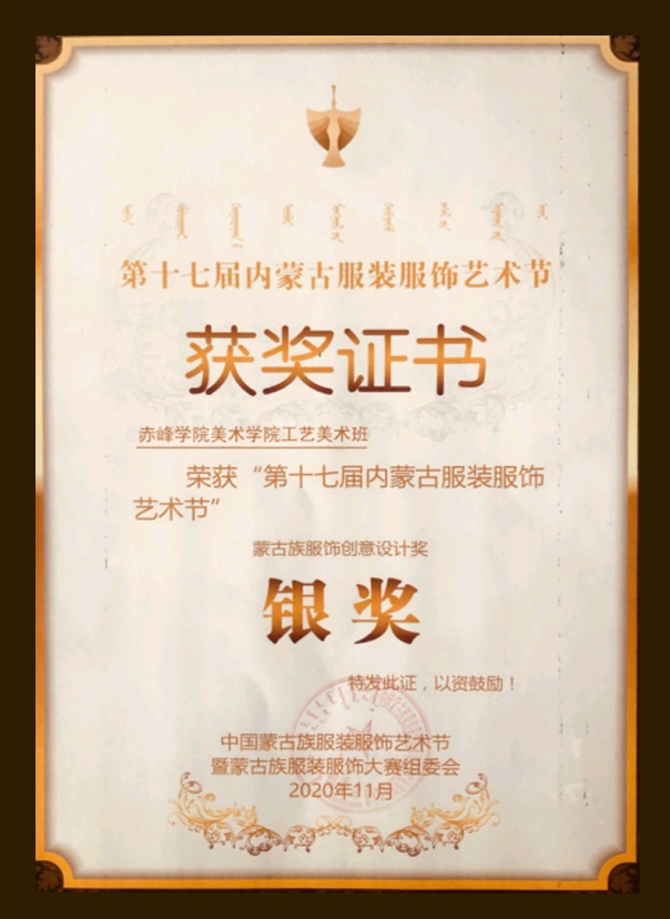 11月11日晚,第十七届内蒙古服装服饰艺术节在通辽市开幕。来自全区各盟市的81支参赛队和新疆、云南、青海、吉林、甘肃等省区的7支参赛队同台竞技,角逐传统、现代、行业、正装礼服、中小学生、男装男帽等6大服饰类别奖项。beat365美术学院工艺美术专业2019级工艺美术班学生在娜仁其其格老师的带领下参加了比赛,并荣获“蒙古族中小学生校服设计制作”金奖、“蒙古族服饰创意设计”银奖。