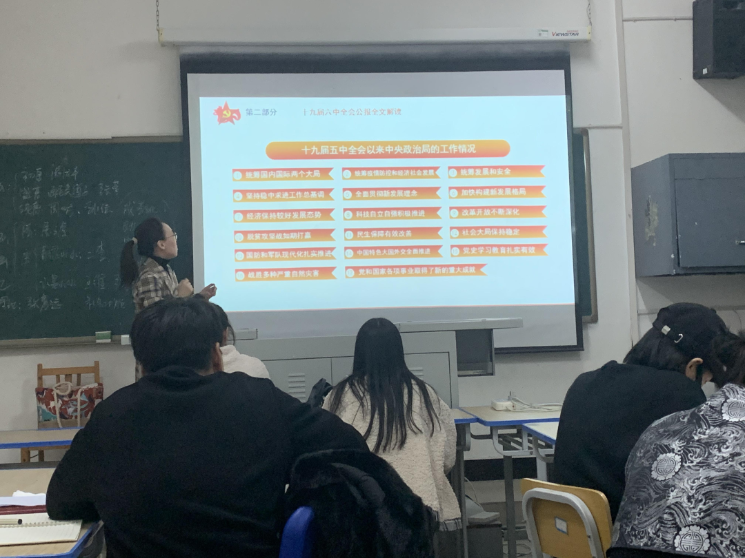 会上,团总支负责人于宗嘉老师指出,要以高度的责任感和使命感认真学习、深刻领会全会精神。十九届六中全会对建党百年历史经验和重大成就进行了系统总结,清晰阐述了习近平新时代中国特色社会主义思想体系,是我们党迈向第二个“百年奋斗目标”的根本遵循。我们的思想政治学习要做到系统学、结合专业学、结合自身学。