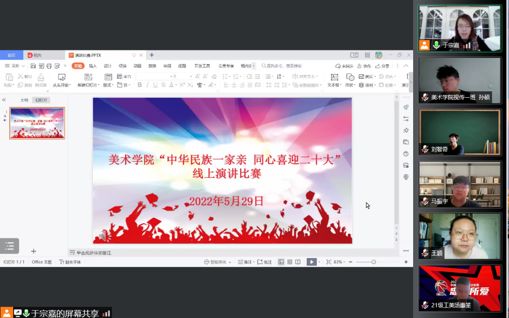 “中华民族一家亲 同心喜迎二十大”线上演讲比赛中,14位参赛选手用真挚的情感、丰富的语言,声情并茂地讲述了自己对“中华民族一家亲,同心喜迎二十大”的理解和认识,抒发了自觉维护民族团结和社会安定的家国情怀,表达了为实现中华民族伟大复兴的中国梦努力奋斗的信心和决心。经过评选,最终,2021级工艺美术班的王子怡获得一等奖;2021级工艺美术班的汤惠筌、2021级视觉传达2班的魏云鹏获得二等奖;2021级汉美3班的王焱、2021级视传2班的张晶晶、2021级视传2班的马振宇同学获得三等奖。