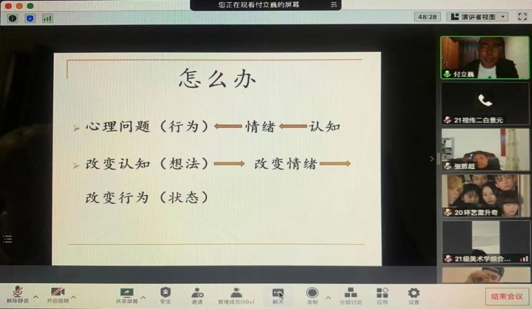 讲座中,付立巍老师以“疫情背景下的心理调适”为中心展开,对如何判断心理问题进行了专业的讲解,针对疫情期间同学们的生活、家庭关系、就业、考研等问题进行了详细的分析,引导同学们调整在家上网课的学习心态,通过自律提高上网课的学习效率,最后通过学习生活中的案例为同学们讲解调适多种心理问题的有效办法。