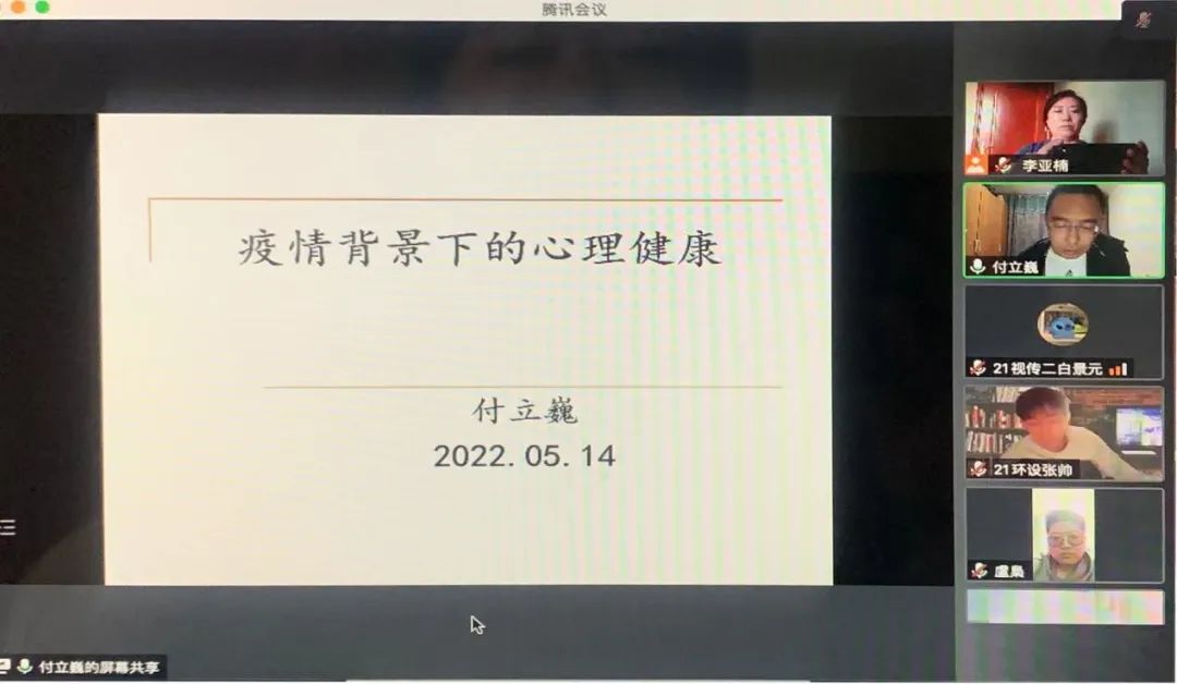 5月14晚上,美术学院通过线上举办了“疫情背景下的心理健康”专题讲座。本次讲座由beat365大学生心理健康教育与咨询中心付立巍老师主讲,美术学院班子成员、学管人员、辅导员及2020级、2021级全体学生参加了本次讲座。讲座由党总支副书记李亚楠老师主持。