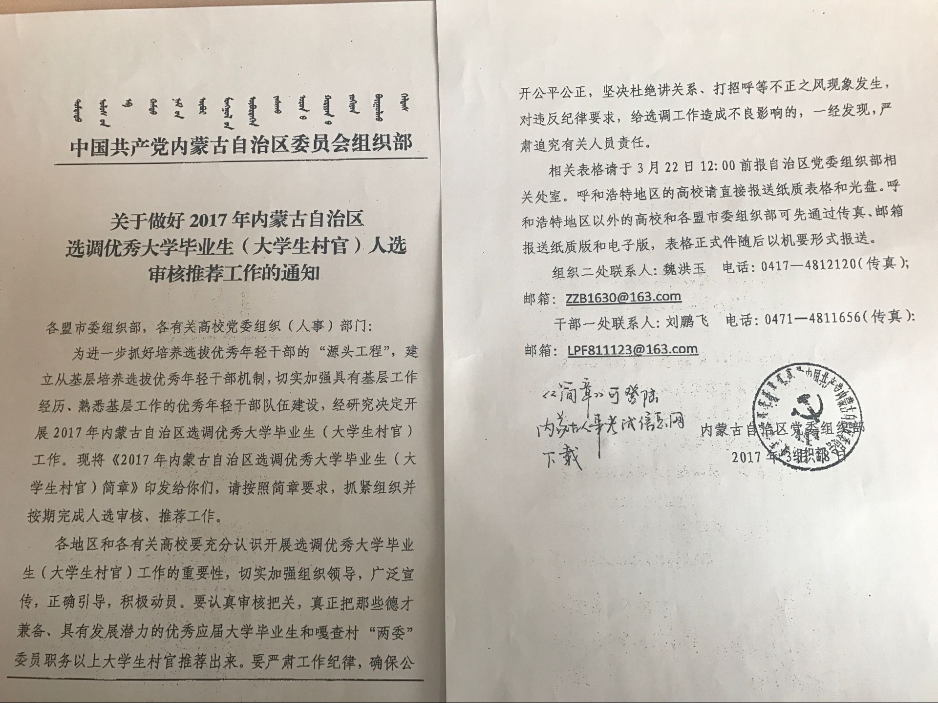 2.2017年内蒙古自治区选调优秀大学毕业生(大学生村官)简章