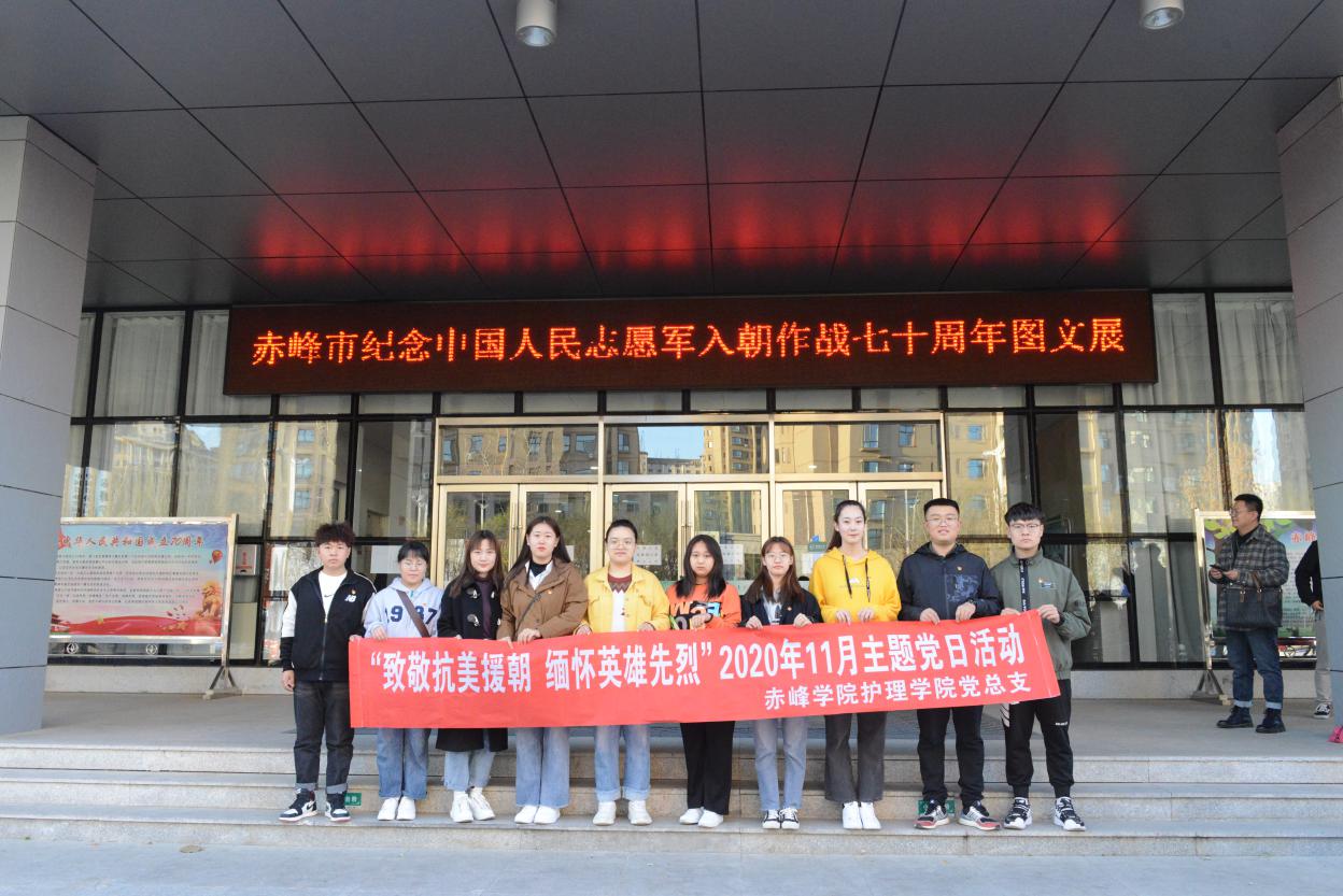 首页» 党群工作» 党建工作 致敬抗美援朝,缅怀英雄先烈 发布日期:2021-03-23 护理学院开展“致敬抗美援朝,缅怀英雄先烈”主题党日活动 ,为纪念中国人民志愿军抗美援朝出国作战70周年,进一步推进“不忘初心、牢记使命”主题教育常态化制度化,我院在2020年11月开展此次主题党日活动,和肿瘤医院的老师们共同参观纪念中国人民志愿军入朝作战七十周年图文展。学生们重温历史,将爱国主义精神转化为振兴祖国的强大动力,以先烈为榜样,以实际行动继承先烈的革命遗志,不忘初心,铭记历史,牢记使命,砥砺前行,永葆共产党员先进本色,为党的事业添光增彩。