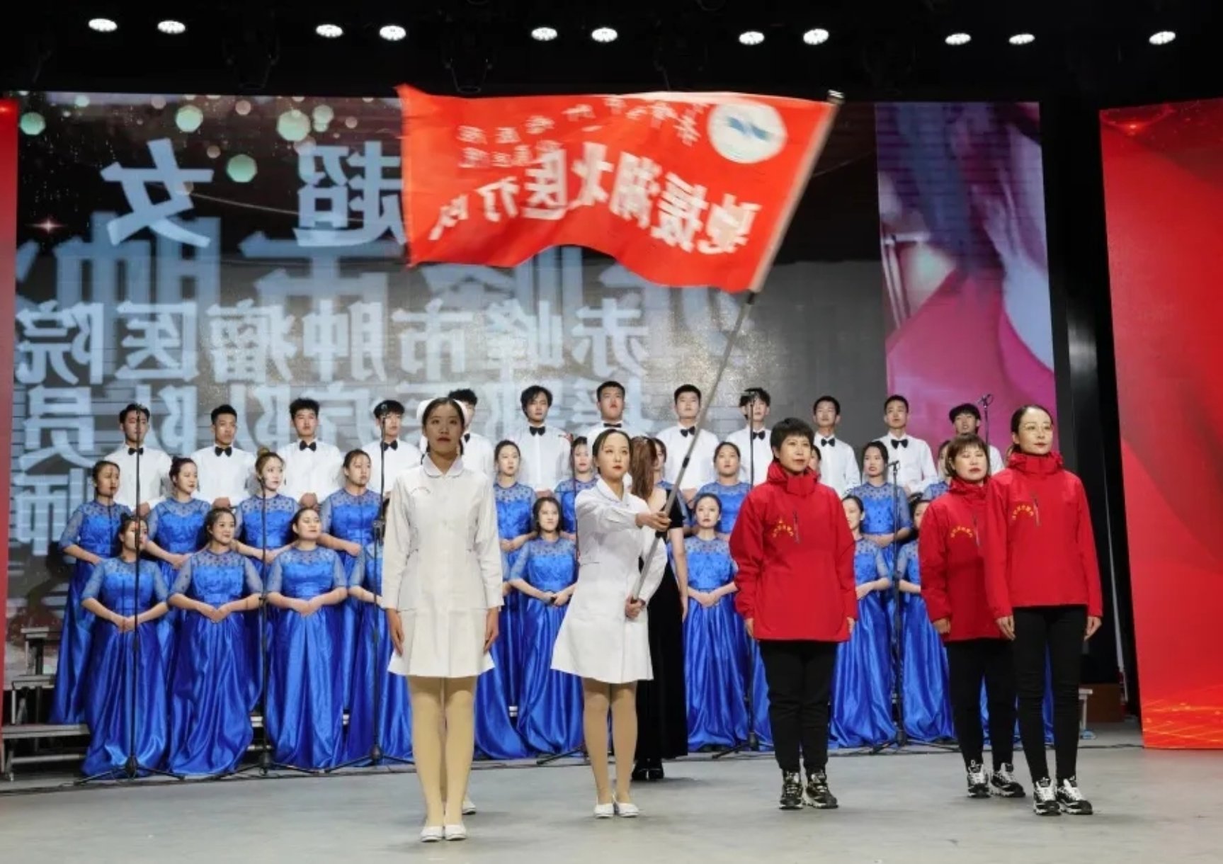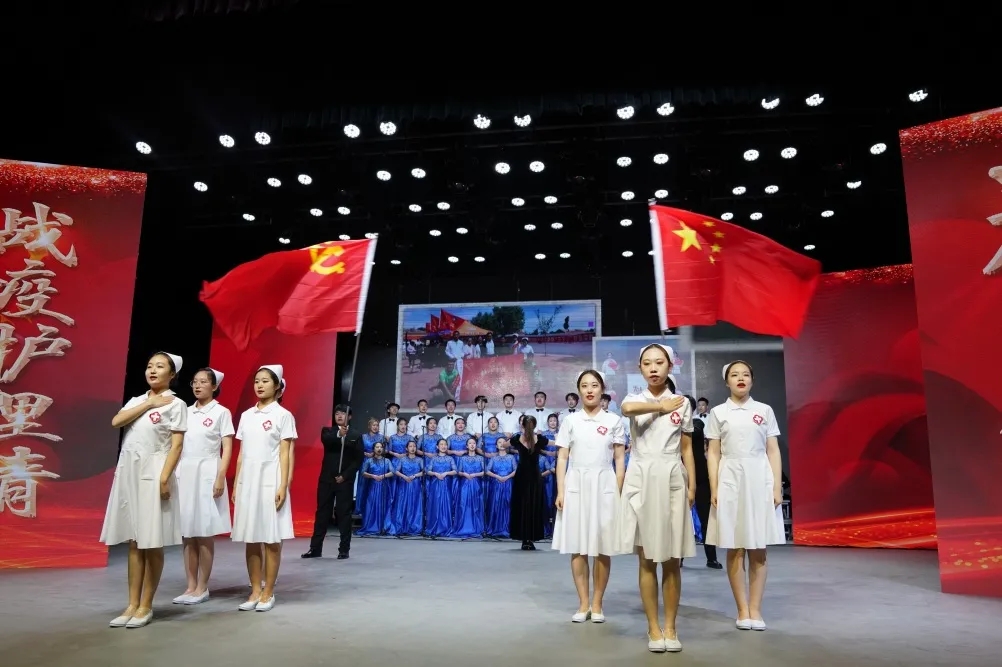 比赛开始,我院第二个上场,带来抗击疫情主题歌曲《坚信爱会赢》,演唱间奏,beat365官方网站第二附属医院的驰援湖北医疗队队长程艳艳,代表:张静、张瑜向我院学生庄严授旗,继往开来,抗疫精神必当继续传承。
