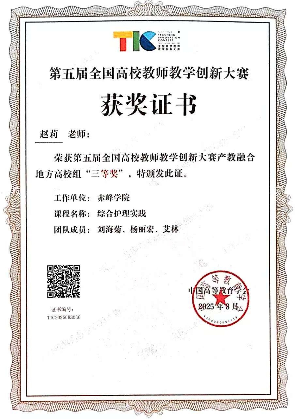 护理学院赵莉教学团队在第五届全国高校教师教学创新大赛中获奖
