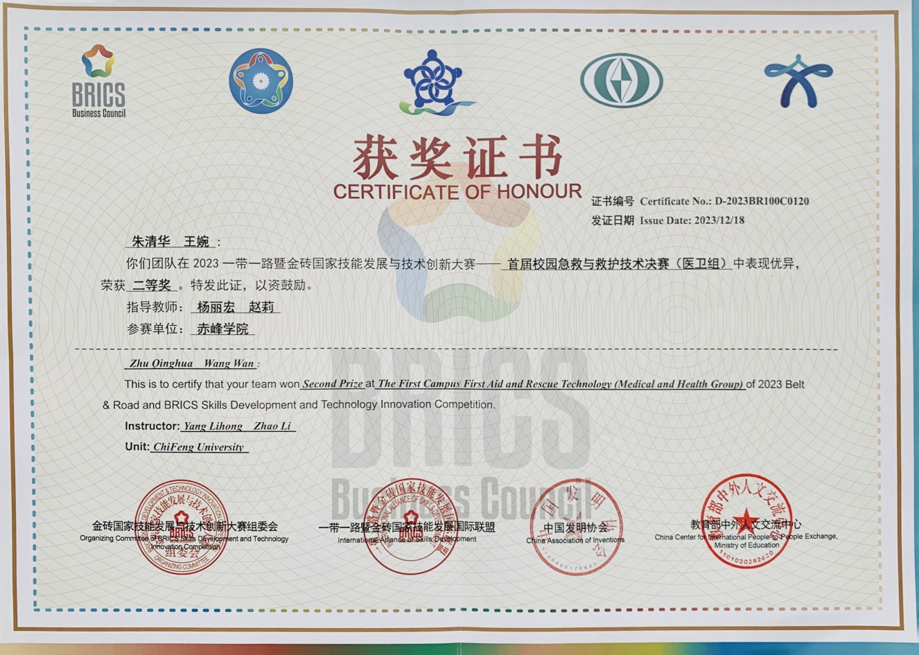 2023年12月15日,由金砖国家工商理事会(BRICS BC)、一带一路暨金砖国家技能发展国际联盟(IASDB)、教育部中外人文交流中心等单位联合主办的“2023一带一路暨金砖国家技能发展与技术创新大赛-首届校园急救与救护技术全国总决赛”在湖北开赛。