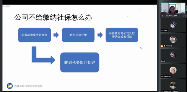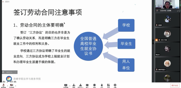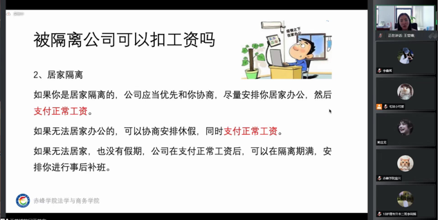 王莹博老师为毕业生介绍了与就业相关的的法律常识,围绕入职时签订劳务合同注意事项、休假安排加班工资、公司不缴纳社保该如何处理、疫情被隔离是否可以扣工资等常见的法律纠纷问题以及离职时经济补偿问题进行详细讲解。