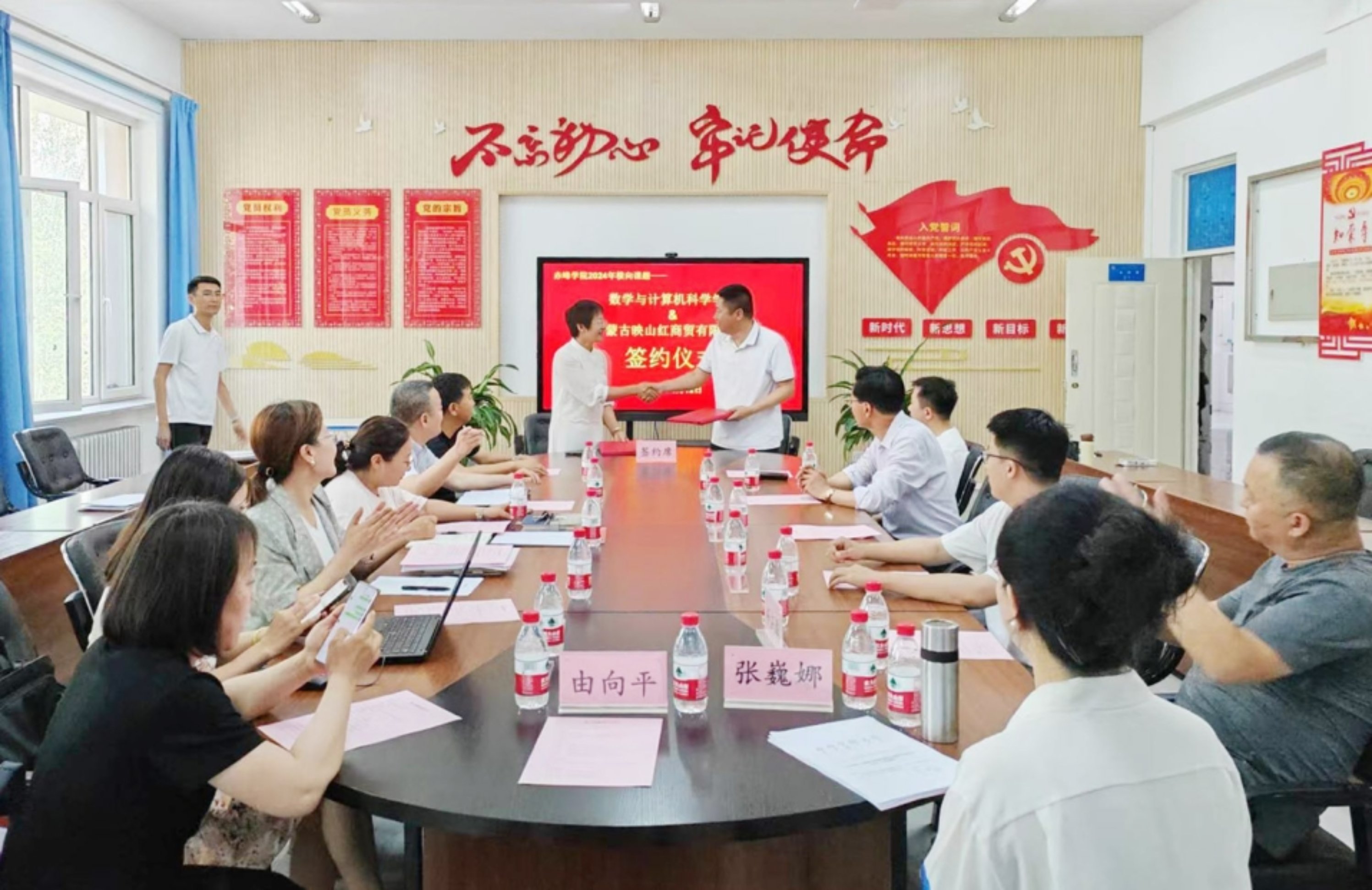 赤峰市昭乌达中学、内蒙古映山红商贸有限公司、赤峰宽景研学科技有限公司、内蒙古磐石建设工程有限公司、内蒙古融云科技有限责任公司五家单位相关负责人,数学与计算机科学学院班子成员、横向课题项目负责人参加签约仪式。仪式由副院长王晓英主持。