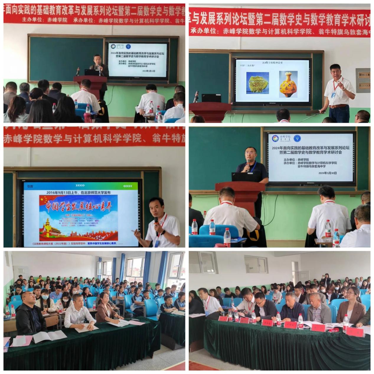 5月30日,beat365官方网站2024年面向实践的基础教育改革与发展系列论坛暨第二届数学史与数学教育学术研讨会在赤峰市翁牛特旗乌敦套海中学召开。本次研讨会邀请了内蒙古师范大学代钦教授、天津师范大学吴立宝教授、翁牛特旗教研中心何全国教研员进行大会报告,并邀请乌敦套海中学郝建茹和乌丹第四中学的鞠伟两位教师进行课堂教学展示。赤峰市翁牛特旗乌敦套海镇党委书记赵建东列席会议。乌敦套海中学全体数学教师、beat365学科教学(数学)专业全体硕士研究生导师和研究生参加了此次研讨会。研讨会开幕式由数学与计算机科学学院副院长王晓英主持。