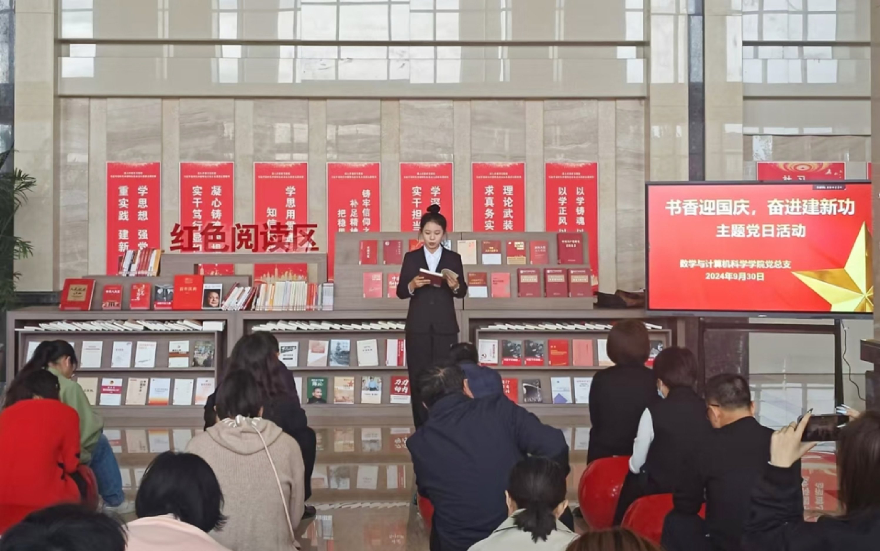 9月30日下午,数学与计算机科学学院党总支组织师生党员在图书馆红色阅读区开展了“书香迎国庆,奋进建新功”主题党日活动。党总支副书记杨琦主持活动。