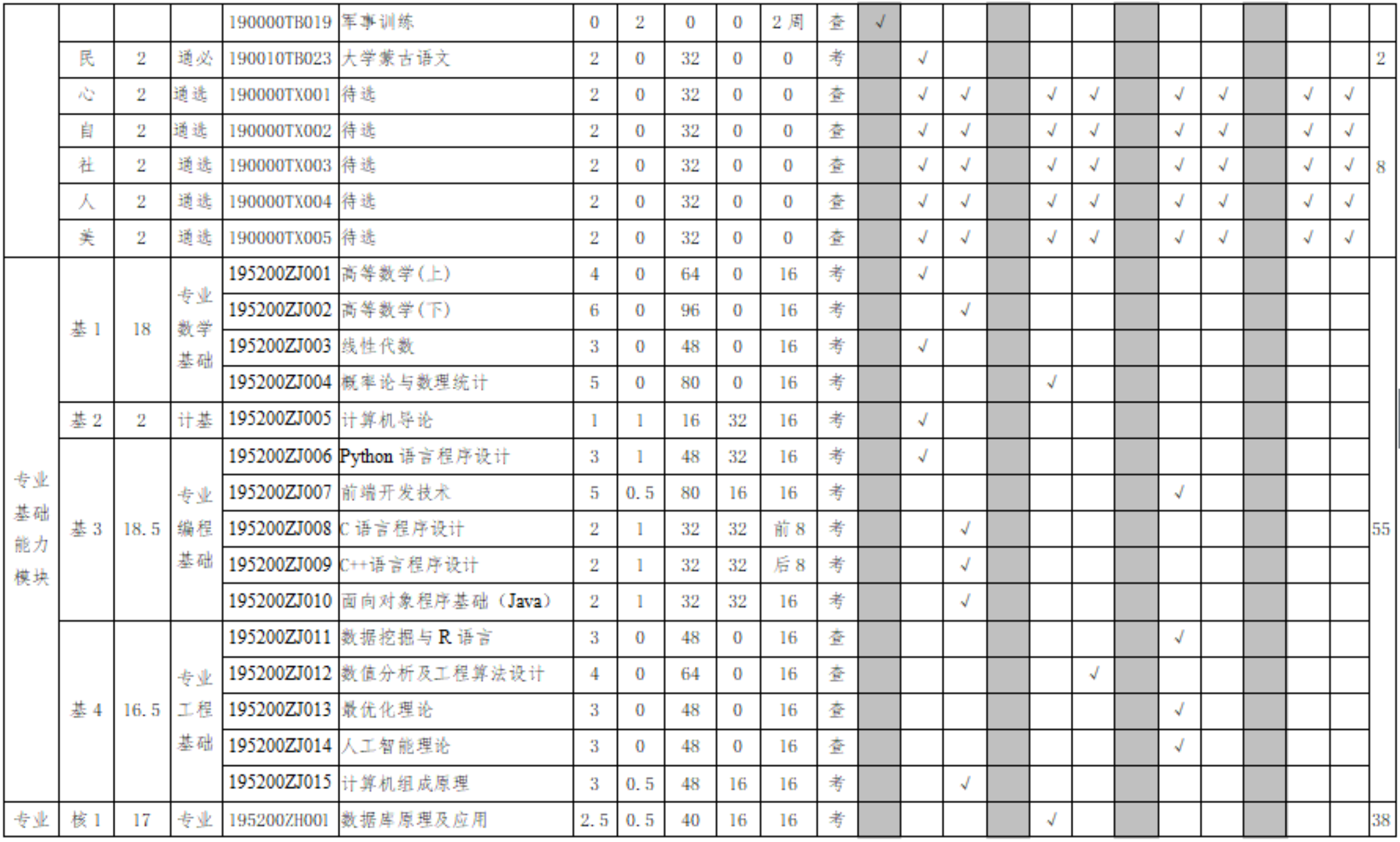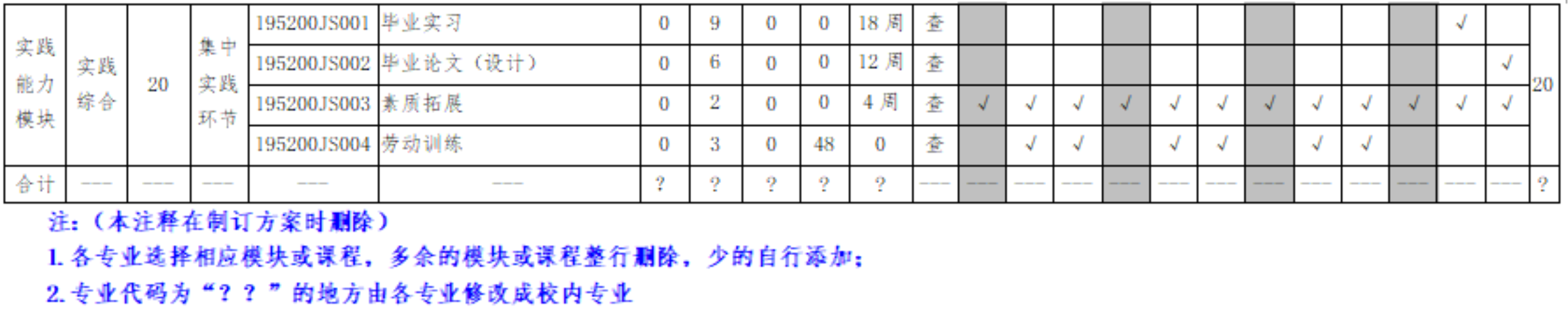 注:1.各专业选择相应模块,多余的模块整行删除;(本注释在制订方案时删除)