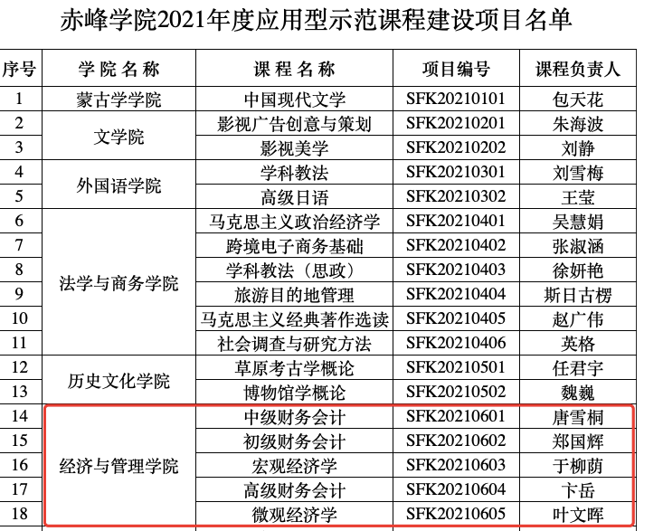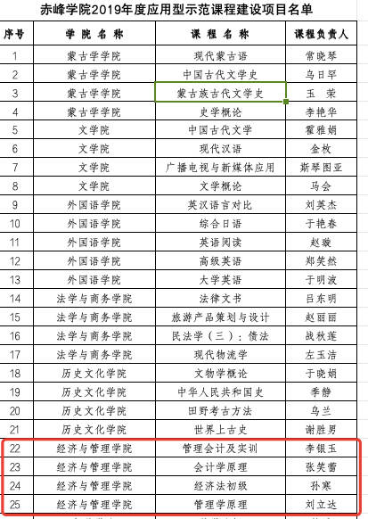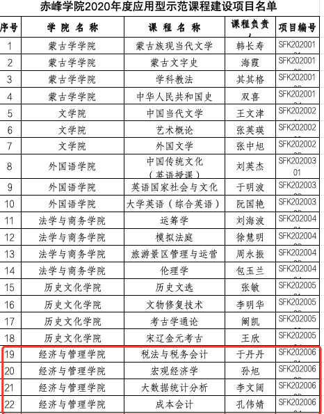 经济与管理学院2019-2022年校级应用型示范课立项名单