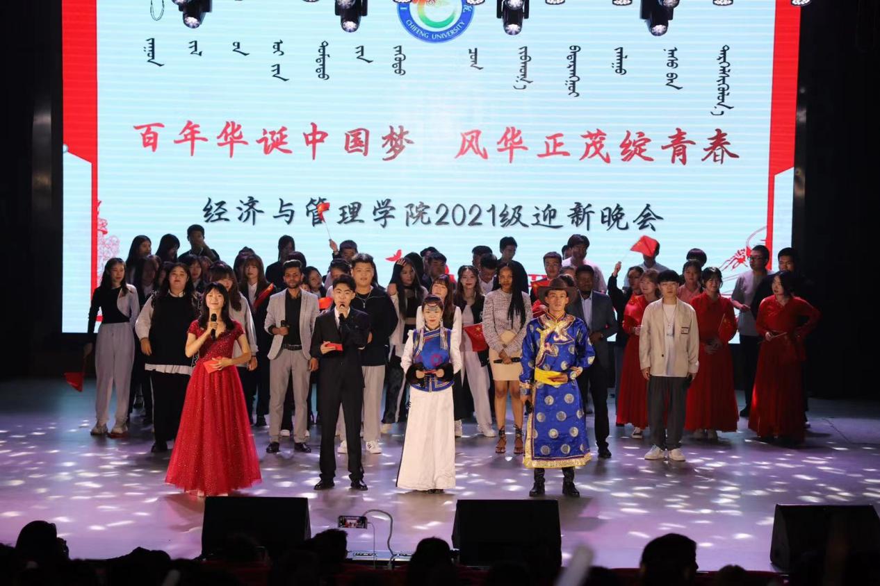 伴随着富有节奏感的歌曲,开场舞《what is love》的舞蹈演员踏着强劲有力的舞步在舞台上火力全开,燃起了全场观众的激情!随后,四位主持人迈着优雅的步伐,宣布迎新晚会正式开始。此次晚会分为了三个篇章:千姿献礼华章、追梦扬帆欢唱、百年红船远航。各个篇章层层递进,环环相扣,以文艺活动的形式展示出年轻一代对文艺的理解和对生活的热爱。歌曲《为内蒙古喝彩》、顶碗舞《祝福》,连续两个节目,表达了内蒙古人民对蒙古族文化的热爱和自豪。由学生自主编排的古典舞《灯火里的中国》一抿一笑尽风情,才子佳人婀娜柔美的舞姿赞美着祖国的繁荣昌盛。说唱《百年》以轻快却引人的节奏带观众走入了中国从弱小到雄起的历史长河,引发了现场观众热烈的掌声。小品《我们在行动》表达了中国共产党领导人民脱贫致富,走向全面小康的坚定决心。情景剧《党旗高高飘扬》,朗诵者慢语轻诉,将台下的观众带入了那个战火纷飞却热血迸发的年代。表演者的真情流露带动着观众,激起了台下观众强烈的爱国情怀!最后,国际教育学院留学生与经济与管理学院学生共同演唱歌曲《我们都是追梦人》, 青春的旋律飘扬在大剧场的上空,贴近生活、催人奋进的歌词引发了台下观众强烈共鸣,晚会在悠扬的歌声中、经久不息的掌声中落下帷幕。