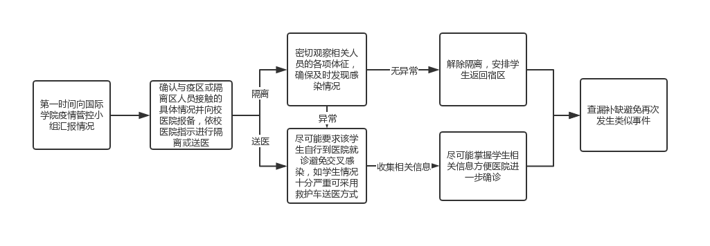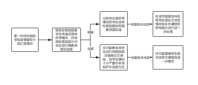 处理此类突发情况时,须首先向学校疫情管控领导小组汇报,同时确认学生生理体征状况。如发现体征异常,须要求学生到医院确认是否感染病毒,对于无明显体征异常的学生,应安排隔离观察。