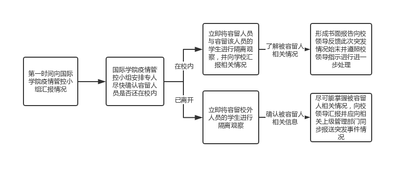 处理此类突发事件时,须第一时间掌握被容留人的相关信息,并与出入境管理局核对。尤其要查清楚被容留人员是否去过武汉或者是否与武汉来人接触过,必要时在向学校汇报后可以申请公安部门协助调查。在与学生及被容留人沟通时要注意自身防护,以避免交叉感染。
