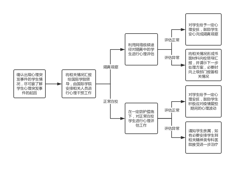 外籍教师或留学生普遍对疫情存在恐慌心理,因此在疫情防控期间很可能出现各种心理突发状况,此类事件属易发生的疫情间接类突发事件。在处理此类事件过程中,应及时向学院防控领导小组汇报进展情况,必要时还要向学校汇报。