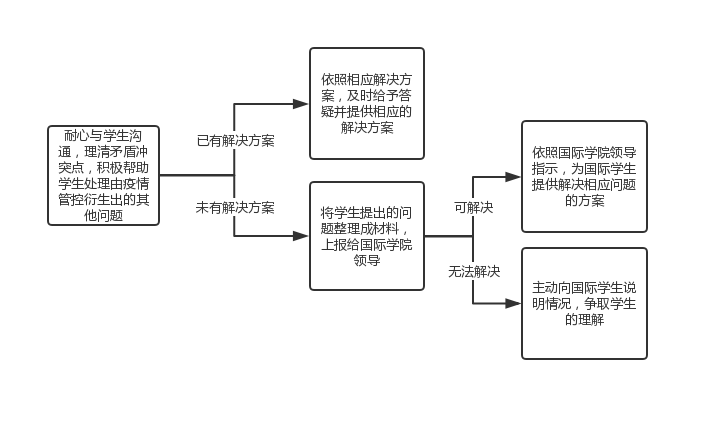 为落实学校疫情防控工作要求,可能会衍生出一些留学生无法理解的情况,进而导致纠纷。如因限制外出无法购物,或因无法按时办理居留许可延期手续而导致不满情绪等。处理此类问题时应尽可能理解学生心理,积极响应,尽力安抚,热情服务,及时回复,提供解决办法,以帮助学生解决困难、树立学校良好口碑为处理此类突发事件的宗旨。
