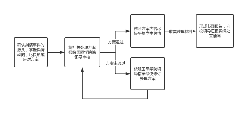 外籍教师或留学生与疫情相关的舆情突发事件是典型的疫情间接类突发事件,这类事件虽然不会对疫情造成直接影响,但很可能给疫情防控工作带来额外的压力,而疫情相关的舆情管控也是上级部门重点强调的工作之一,因此此类事件也是疫情防控期间应重点关注的突发事件类型。如国教院层面对舆情掌控判断不确定,则应第一时间上报学校领导研判,并按照指示妥善处理。