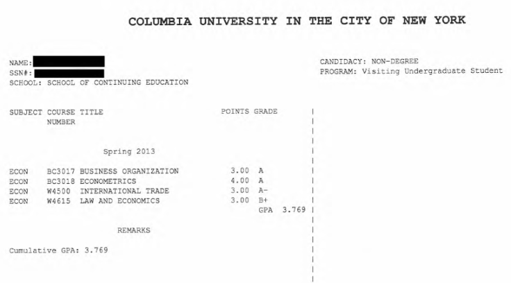 右图:哥大专业学分课程成绩单样图