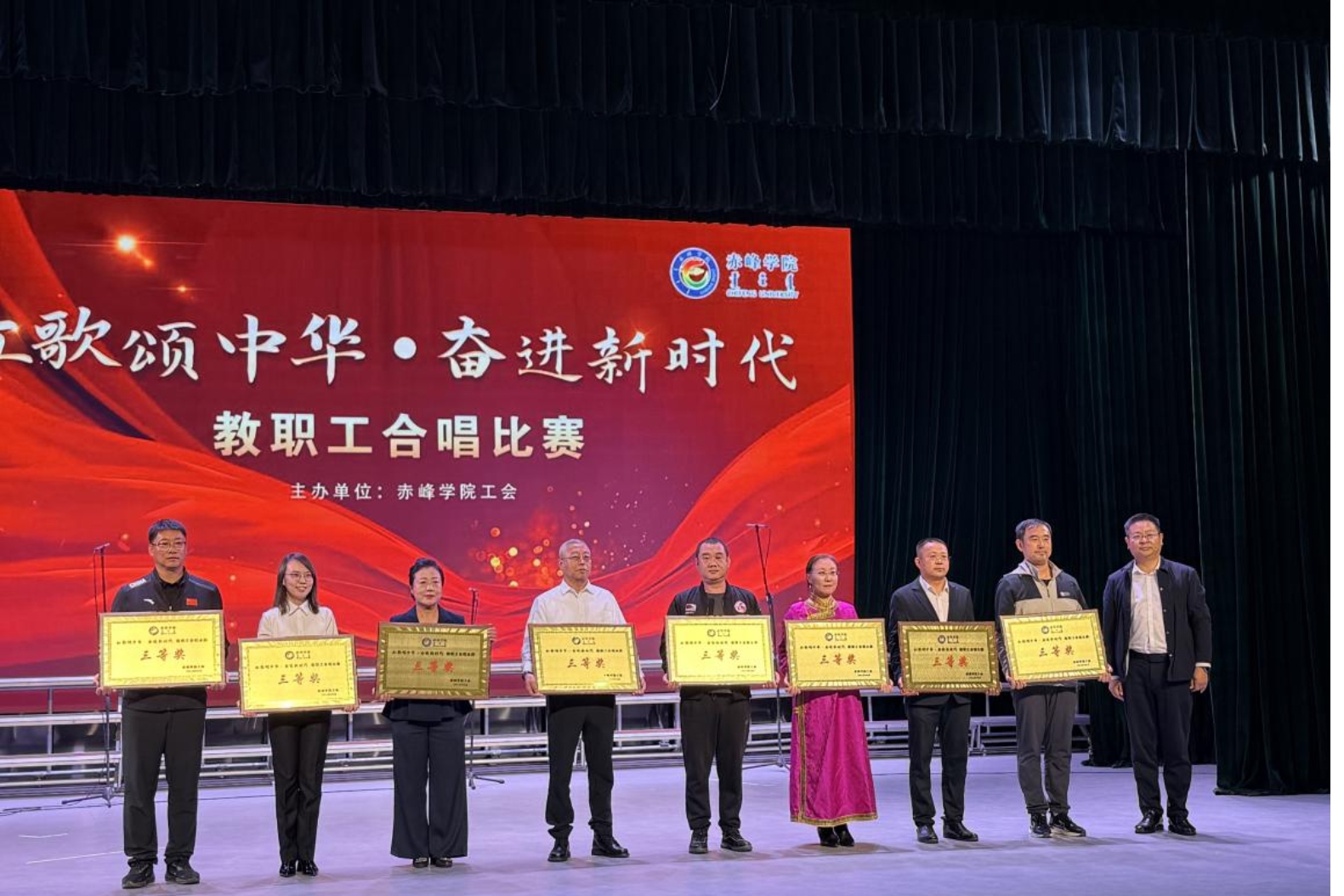 历史文化学院代表队选取了《我们走在大路上》和《龙文》两首歌曲参赛,经过专业老师的指导和反复认真的排练,教师们带着饱满的热情与昂扬的精神状态站上舞台。《我们走在大路上》的旋律铿锵有力,展现出新时代教育工作者阔步向前的坚定信念;《龙文》的曲调温婉典雅,传递出对中华优秀传统文化的深情礼赞。