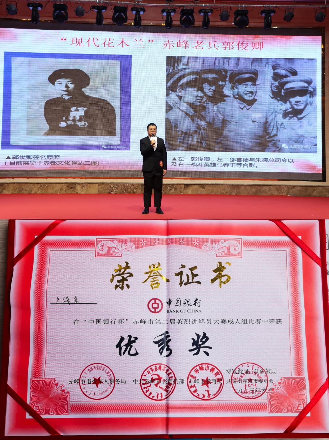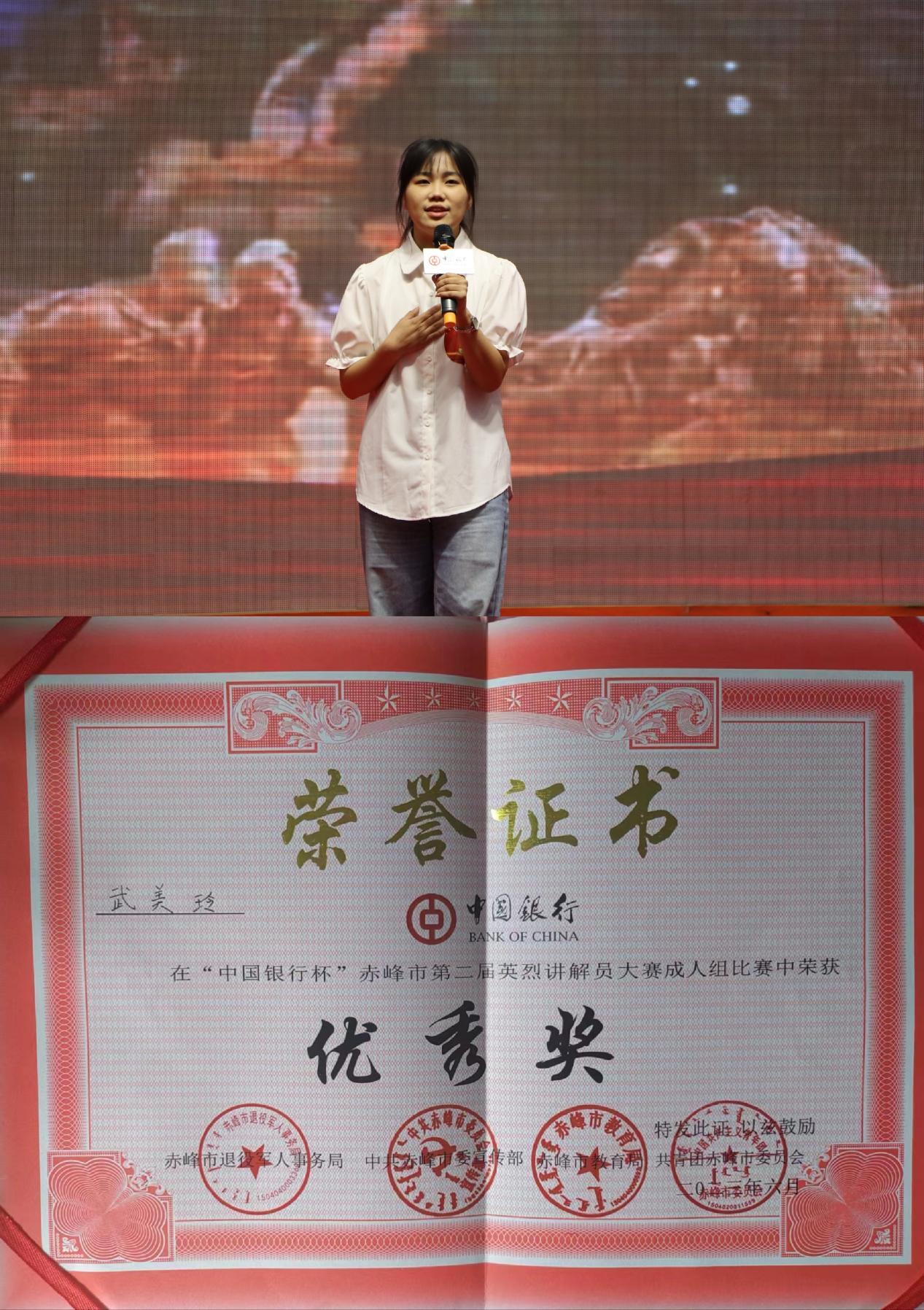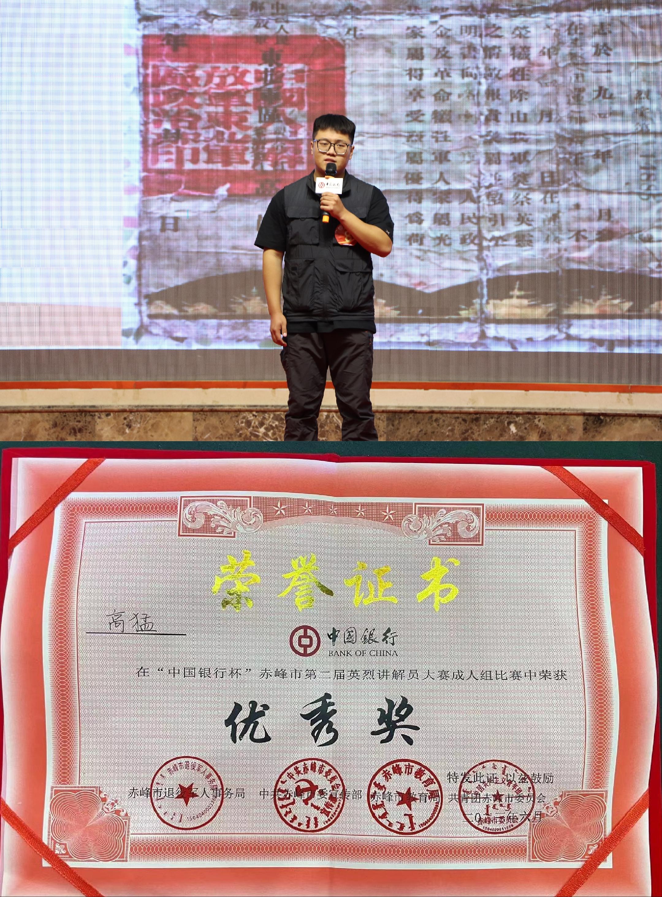 6月10日,由赤峰市退役军人事务局、市委宣传部、市教育局、团市委联合举办的“中国银行杯”赤峰市第二届英烈讲解员大赛(成人组)决赛在九天国际酒店四楼多功能厅举行。历史文化学院2021级考古学本科班卢瑞宏、高猛,2022级文物保护技术本科班武美玲三名同学参加比赛,并获得成人组优秀奖。