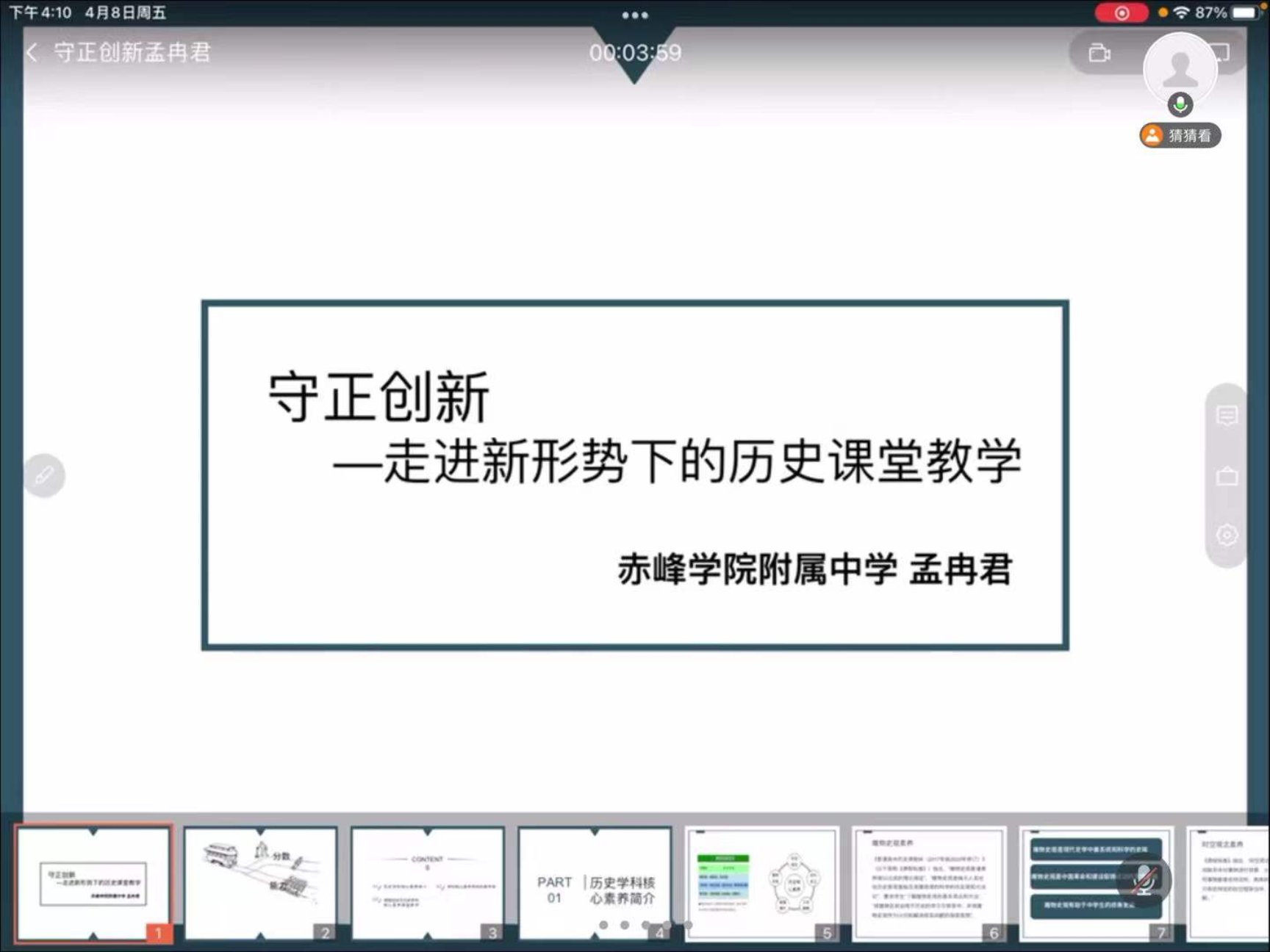 历史文化学院学科工作坊于2022年4月8日下午邀请beat365官方网站附属中学孟冉君老师做了以“守正创新,走进新形势下的历史课堂教学”为主题的讲座。我院教育硕士导师、学科历史研究生及本科生聆听了讲座。讲座由于晓娟老师主持。