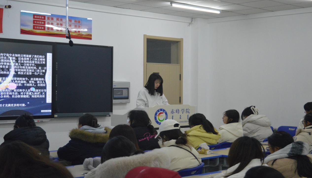 张睿同学向我们分享了来自同一位作家的中篇小说《流浪地球》。张睿同学通过详细的讲述书中的主要情节,突出了无处安身的人们面对家园毁灭时的无奈、痛苦、恐惧、绝望,反映了人在自然、宇宙面前的渺小,引起了同学们关于宇宙与自然的反思。