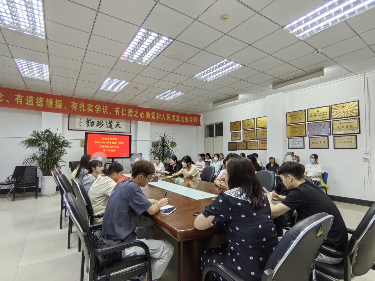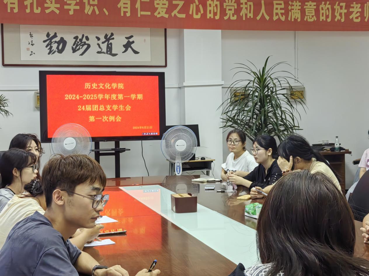 为迎接新学期的到来并确保学生会各项工作的有序开展,深化学生会内部建设,全面提升学生成员的工作能力和责任意识,明确新学期的核心任务和工作导向,历史文化学院于2024年8月21日晚上,召开了2024-2025学年度第一学期24届团总支学生会第一次例会,全体学生会成员参加。