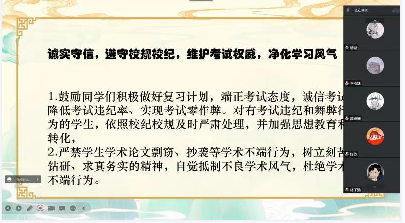 (5)活动成效:通过主题鲜明的教育活动,鼓励学生积极做好复习计划,端正考试态度,以考试违纪、作弊警示教育为重点,让学生充分认识到考试的严肃性和作弊的危害性,降低考试违纪率直至实现考试零作弊。对有考试违纪和舞弊行为的学生,依照校纪校规及时严肃处理并加强思想教育和转化。要加强学生学术论文剽窃、抄袭等学术不端行为的查处力度,通过发布倡议书、开展签名承诺、召开主题班会等活动,引导学生树立刻苦钻研、求真务实的精神,自觉抵制不良学术风气,杜绝学术不端行为。