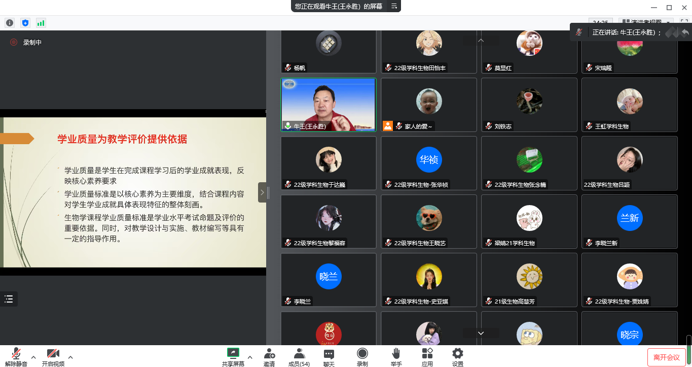 首先,由李静老师对学术导师、实践导师和导师组的成员进行了介绍。随后,东北师范大学王永胜教授为同学们开展了“聚焦学科核心素养的生物学教学研究课题选择”教育讲座;赤峰市教研员孔令奎教授也就“三尺讲台系国运,培根铸魂育新人”进行了精彩的讲授。