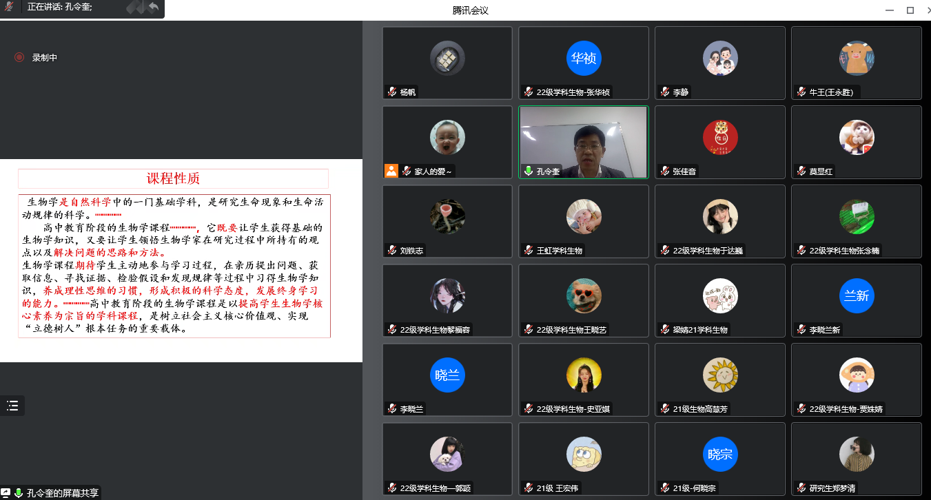 化学与生命科学学院副院长赵丽敏教授就研究生培养相关文件进行了详细解读,使学生对学院研究生课程设置、培养计划有了初步了解的同时,也帮助大家进一步明确了研究生在校期间的学习规划,引导同学们以积极向上的心态迎接新一阶段的学习。最后,赵丽敏副院长对本次会议进行了总结,全体与会人员云端合影留念。