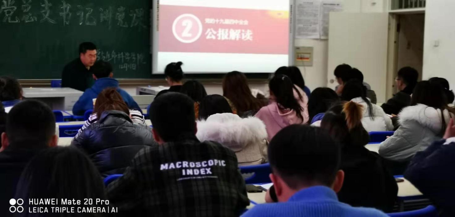 2019年12月11日下午,我院何荣杰书记在崇实楼308教室,以《学习贯彻党的十九届四中全会精神》为题,为27名预备党员及入党积极分子上了一堂生动精彩的专题党课。