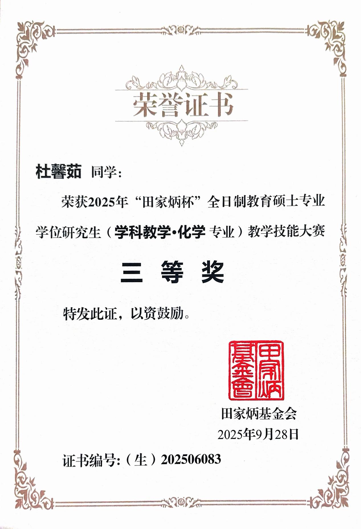 2025年9月26日至28日,由全国教育专业学位研究生教育指导委员会主办的2025年全国"田家炳杯"全日制教育硕士专业学位研究生教学技能大赛决赛在哈尔滨师范大学隆重举行。经过激烈角逐,我院2024级学科教学(化学)专业研究生杜馨茹同学在赵丽敏副院长的全程指导下,凭借扎实的专业素养和出色的教学表现,最终荣获全国三等奖。