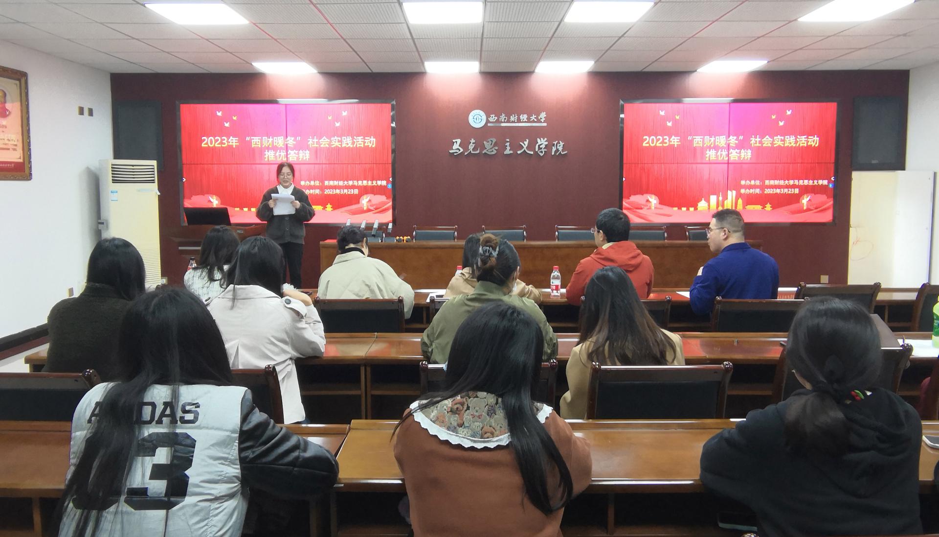 为深入学习宣传贯彻党的二十大精神,按照学校2023年“西财暖冬”社会实践活动安排,3月23日下午,5357cc拉斯维加斯于通博楼A117室举办“西财暖冬”社会实践活动推优答辩会。学院党委副书记、纪委书记钟芸莹,班主任王广杰、王珊珊、苏正道、宋婧琳老师作为评委参与此次答辩。