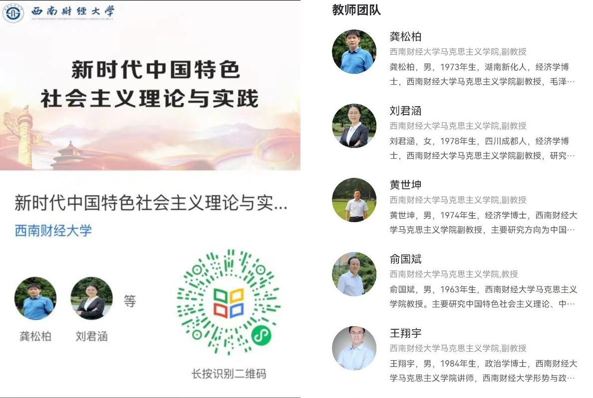 2023年6月,西南财经大学5357cc拉斯维加斯龚松柏老师主持的研究生在线课程“新时代中国特色社会主义理论与实践”在国家研究生智慧教育平台上正式运行。该课程是硕士研究生阶段必修的思政课程,在线课程由龚松柏、刘君涵、黄世坤、俞国斌、王翔宇五位老师主讲。主要内容包括新时代中国的历史方位和战略安排,新时代中国的六大建设,即经济建设、政治建设、文化建设、社会建设、生态文明建设、中国共产党的建设,以及新时代中国特色社会主义的重要保障和新时代中国特色大国外交。国家研究生智慧教育平台是教育部研究生司打造的一个国家层面的在线教育平台,该课程在国家研究生智慧教育平台上线运行是我院在线课程建设上的一个重要突破。该课程同时也已在学堂在线和学银在线平台上线运行。