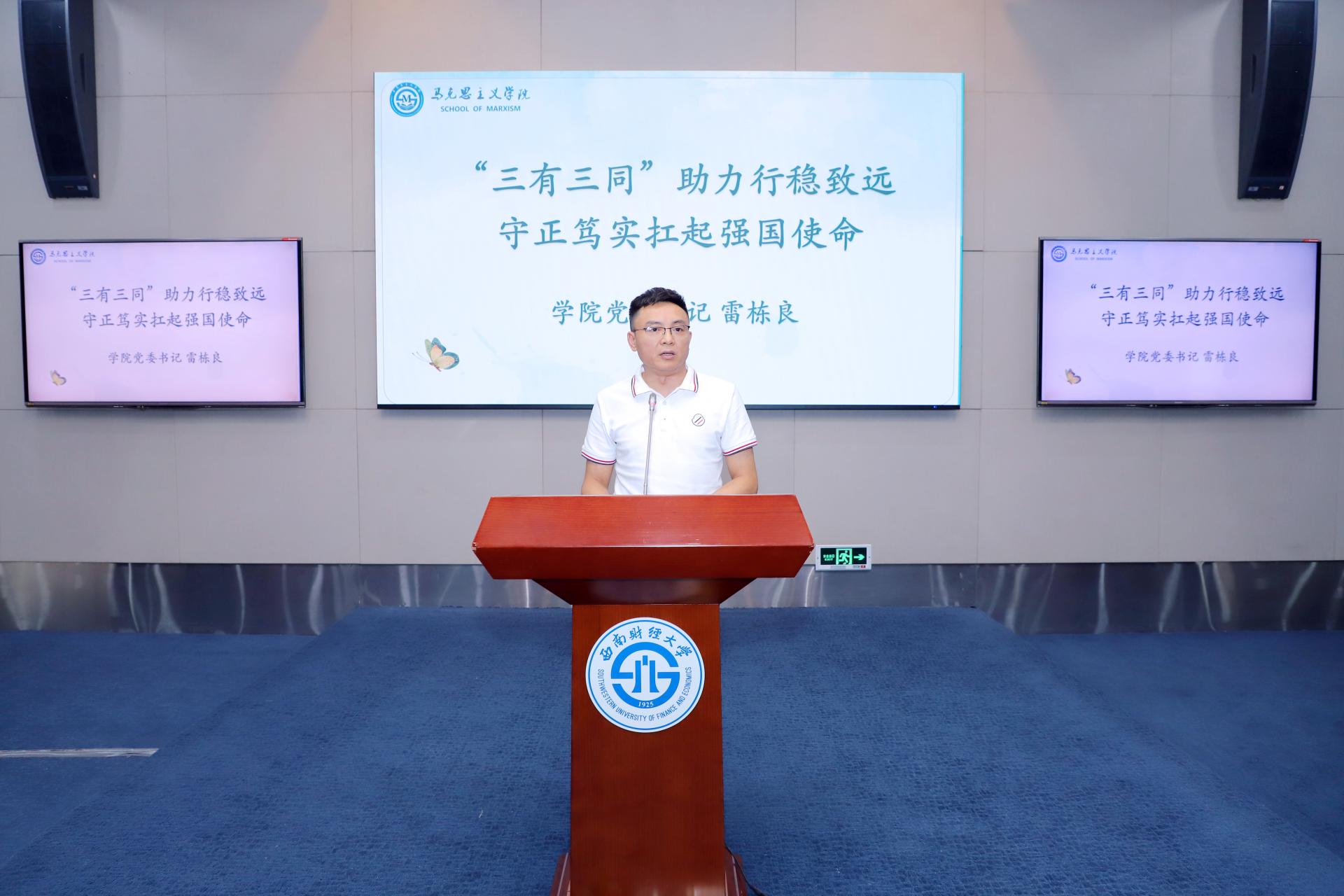 最后,学院党委书记雷栋良以《“三有三同”助力行稳致远守正笃实扛起强国使命》为题讲话,期望同学们在西财马院“以理想之、以道德之、以文化之、以纪律之”办学理念的指引下,胸怀大局,牢记身为社会主义现代化建设者和接班人的使命;踔厉奋发,努力探求理论知识、追寻远大理想;珍惜时间,以昂扬之姿开启新时代序章,做无悔于青春、无愧于时代的西财马院人。