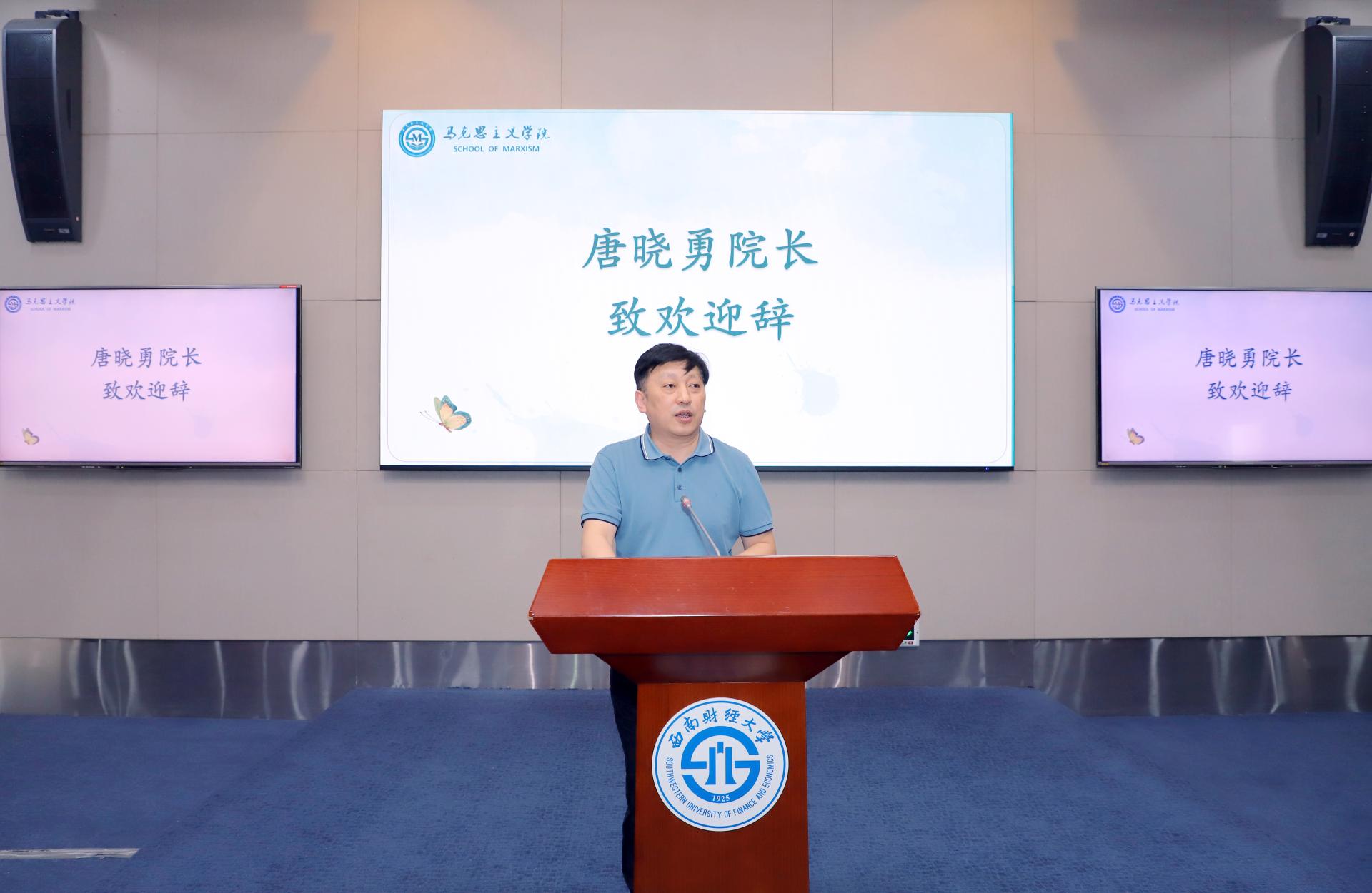 首先,学院院长唐晓勇教授以《奋斗者,正青春》为题致欢迎辞。代表全院师生欢迎新同学成为西财马院的一员,向同学们讲述了西财马院深厚的文化积淀以及为党育人、为国育才的神圣使命,并且引用习近平总书记关于青年工作的重要论述激励同学们勇做新时代的奋斗者,利用西财马院这一良好的学习发展平台,端正自我、确立自我,怀揣梦想、潜心读书,躬身实践、严于律己。