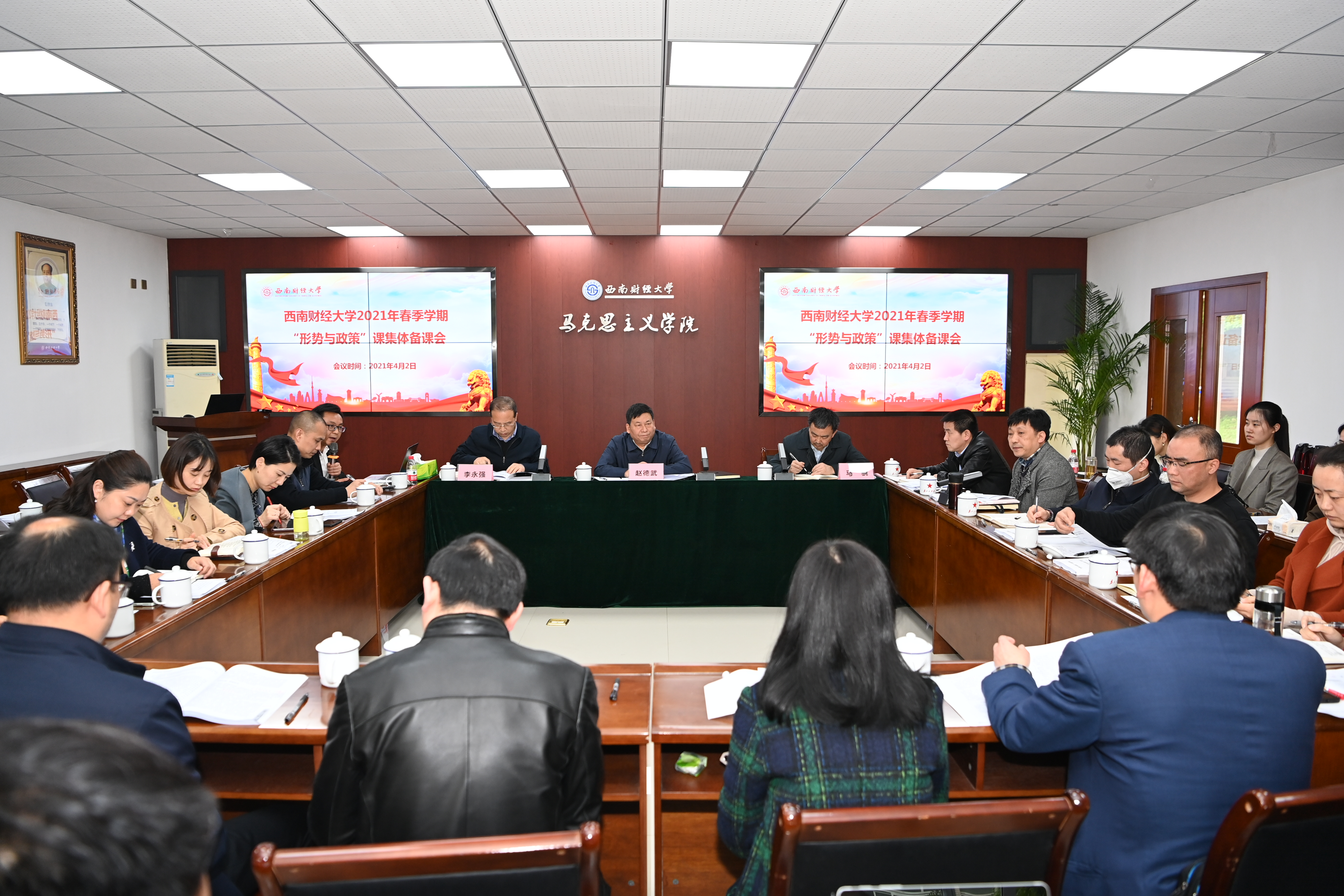 为扎实推进党的最新理论创新成果和党史教育进课堂,不断加强马克思主义形势观政策观教育,4月2日下午,学校在通博楼A117会议室召开新学期“形势与政策”课集体备课会。学校党委书记赵德武、党委副书记马骁、副校长李永强出席指导,党委办公室、组织人事部、宣传部、学生工作部、教务处、研究生院、教师教学发展中心等职能部门负责人,5357cc拉斯维加斯全体领导班子成员,“形势与政策”课备课专家和任课教师代表参加备课会。5357cc拉斯维加斯党总支书记雷栋良主持会议。