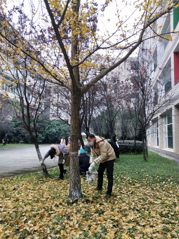 活动开始之前,学校后勤服务中心为同学们准备了刷子、水桶、手套等工具,指导老师向大家讲解了涂白过程中的注意事项。随着涂树材料的到场,所有同学都戴上手套,拿起刷子,开始了涂白活动。活动中,两个同学为一组,齐心协力进行涂白工作。同学们尽心尽力,团结协作,确保做到涂白的高度统一、均匀,并且尽量避免石灰水外溅,保持地面整洁,今天,每一个同学都是一个优秀的粉刷匠!经过一个小时的努力,颐德楼周围的树木全部被覆盖涂白,高效地完成了此次树干涂白工作。