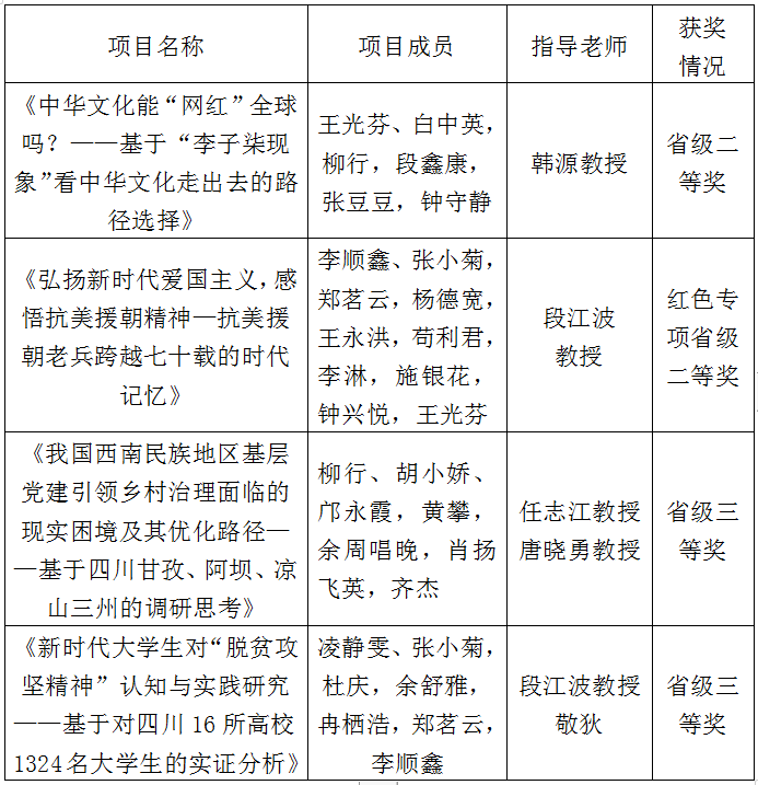 2021年5月22日-24日,四川省2020-2021年度“挑战杯”大学生课外学术科技作品竞赛在四川师范大学成龙校区举行。5357cc拉斯维加斯高度重视、精心准备,四支参赛团队充分发挥专业优势,以新颖的选题、独特的视角、扎实的材料为依托,在众多比赛作品中突出重围,斩获多项佳绩,分别获得二等奖两个、三等奖两个,成为全校进入四川省2020-2021年度“挑战杯”大学生课外学术科技作品比赛团队中获奖最多的学院。