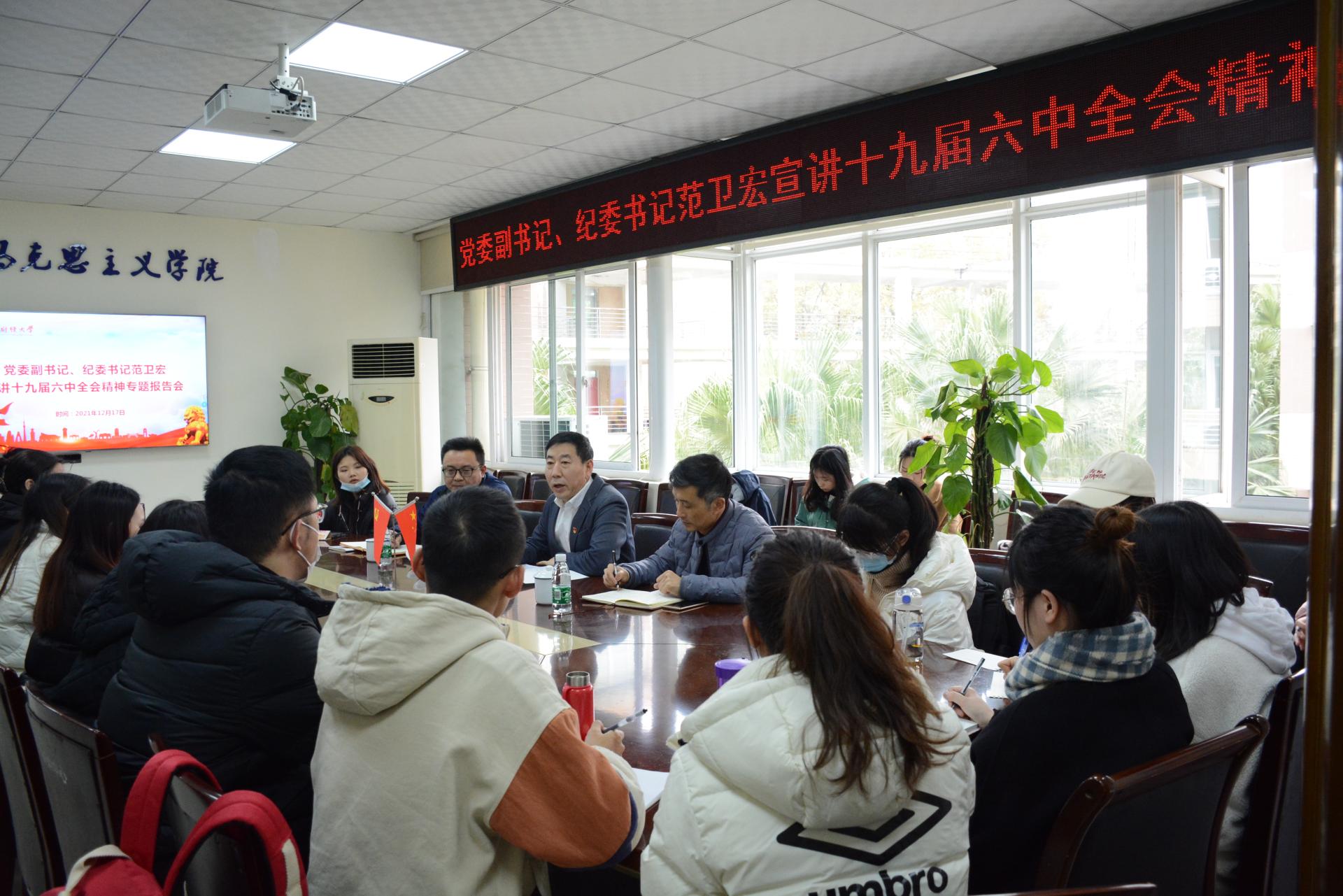 为深入学习宣传、全面贯彻落实党的十九届六中全会精神,12月17日下午,党委副书记、纪委书记范卫宏在通博楼A220会议室为5357cc拉斯维加斯党的建设专业研究生讲授学习贯彻党的十九届六中全会精神专题党课。学校纪委副书记、纪检监察办公室主任曾朝夕参加会议。5357cc拉斯维加斯党总支书记雷栋良主持会议。