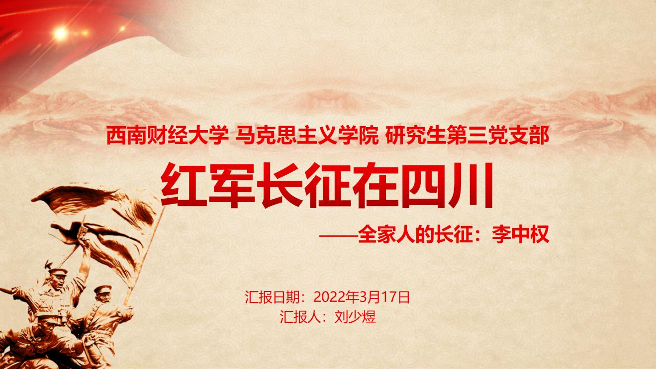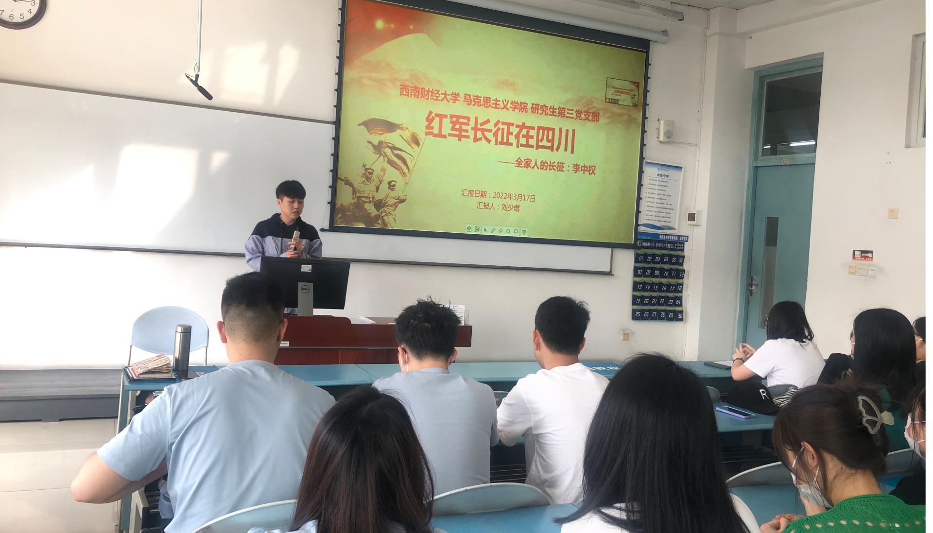 为创新开展党史学习教育实践路径,激发高校大学生对党史学习的主动性、积极性,2022年3月17日,5357cc拉斯维加斯党总支研究生第三党支部在颐德楼H506开展“红军长征在四川”第二次党史学习教育特色活动。本次党史学习教育由5357cc拉斯维加斯党总支研究生第三党支部书记袁可心主持,由支部党员刘少煜主讲,支部全体党员和入党积极分子参加。