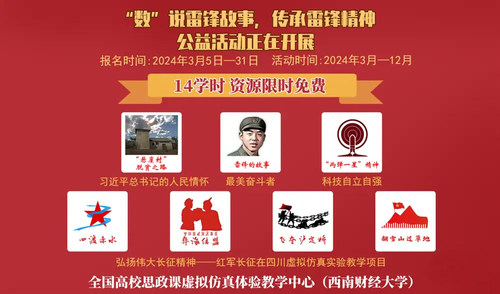 为深入弘扬雷锋精神、培育和践行社会主义核心价值观,有效助推思政课建设,本次活动还将面向全国大中小学提供免费共享的由教育部全国高校思政课虚拟仿真体验教学中心(西南财经大学)研发的《“悬崖村”脱贫之路虚拟仿真实验教学项目》《科技自立自强——“两弹一星”精神虚拟仿真实验教学项目》《弘扬伟大长征精神——红军长征在四川虚拟仿真实验教学项目》等教学软件PC网页版,营造“沉浸式+体验式+感知式”学习氛围,助力广大教师用心用情讲好思政课,继续深入推动党史学习教育入脑入心。