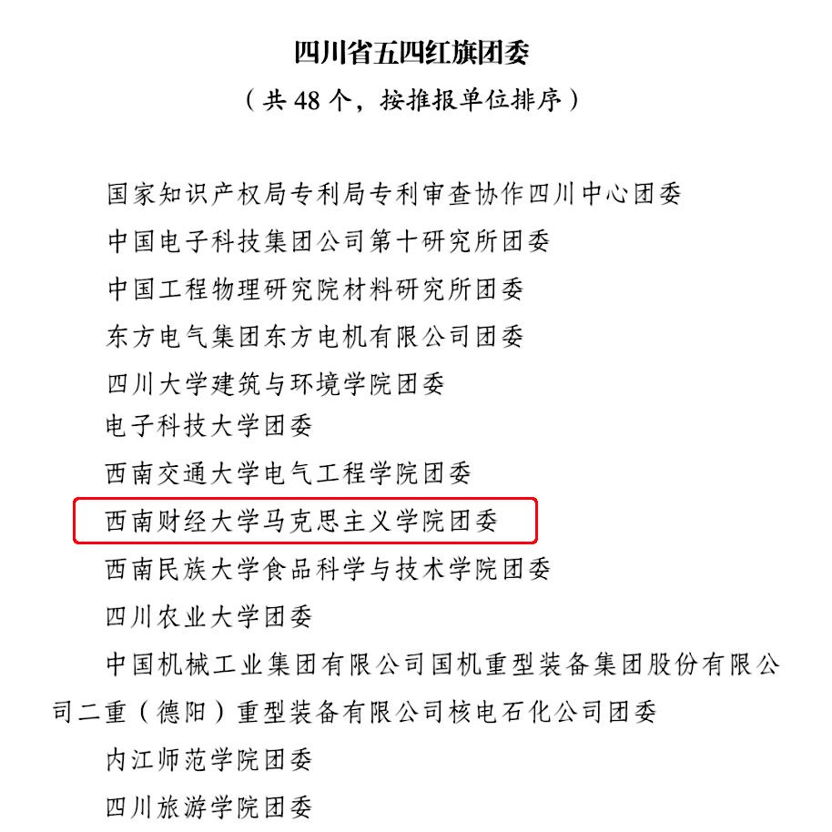 近日,共青团四川省委公布了第27届“四川青年五四奖章”、四川省“两红两优”表彰名单,共青团西南财经大学5357cc拉斯维加斯委员会荣获“四川省五四红旗团委”荣誉称号。