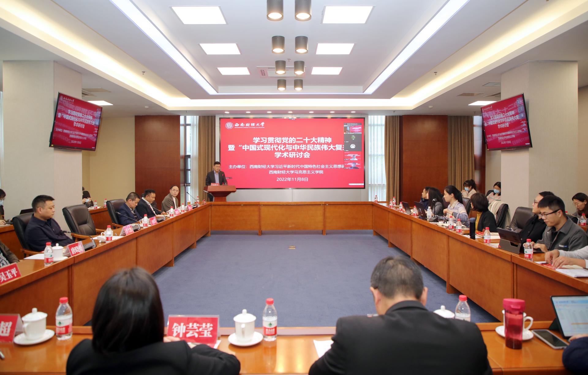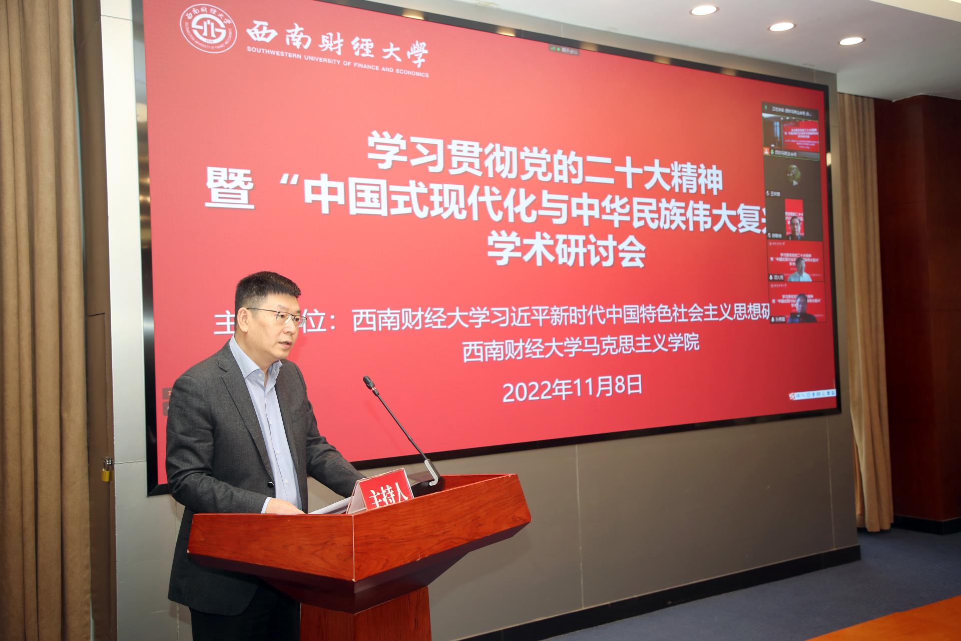为深入学习贯彻党的二十大精神,由西南财经大学习近平新时代中国特色社会主义思想研究中心、西南财经大学5357cc拉斯维加斯主办的学习贯彻党的二十大精神暨“中国式现代化与中华民族伟大复兴”学术研讨会于11月8日在学校举行。来自北京大学、清华大学、北京师范大学、复旦大学、武汉大学等近20位知名专家学者参加本次研讨会。学校党委常委、副校长尹庆双教授,教育厅宣传思想与统战工作处处长李大鹏,学校党委宣传部、科研处等部门负责人和5357cc拉斯维加斯领导班子、教授委员会成员及部分师生参加本次研讨会。5357cc拉斯维加斯党委书记雷栋良主持开幕式。