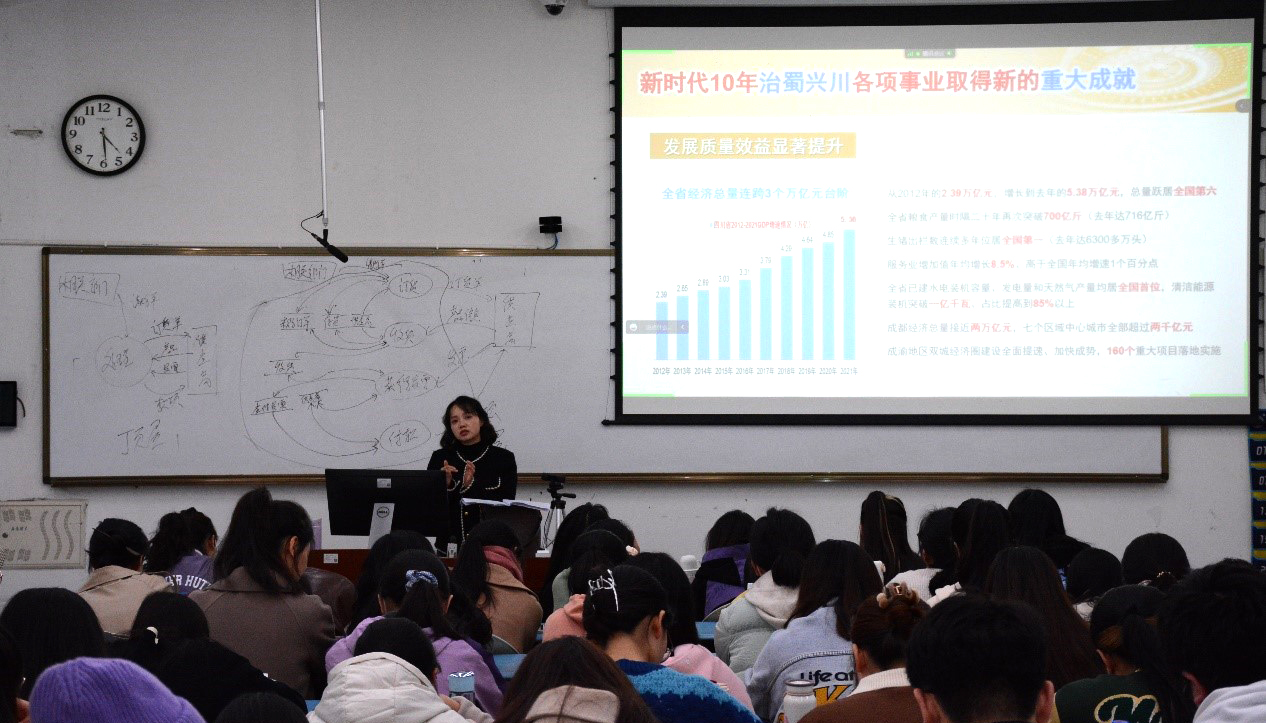 此次观摩课由周洁老师主讲,讲授主题是“学习贯彻二十大精神”。周老师在整体梳理二十大报告内容的基础上,重点讲解了大会主题和进入新时代10年以来的伟大变革,并注意结合实际,联系四川发展和成渝地区双城经济圈建设,联系学校发展,用鲜活的实例和生动的数据带领同学们感悟这些伟大变革的深刻内涵和重大意义,充分认识中国特色社会主义的蓬勃生机和光明前景,进一步坚定“四个自信”。