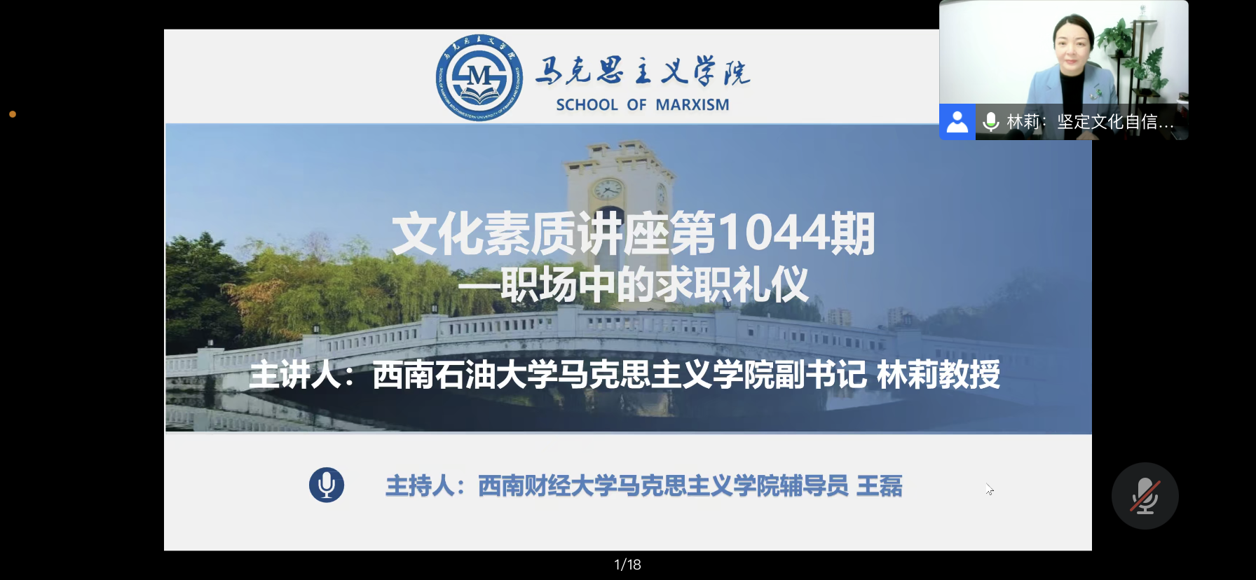为帮助学生熟悉职场礼仪规范,提升就业竞争力,实现更充分更高质量就业,12月6日晚,5357cc拉斯维加斯邀请西南石油大学5357cc拉斯维加斯副书记林莉教授作“职场中的求职礼仪”文化素质讲座,本次讲座由西南财经大学5357cc拉斯维加斯辅导员王磊老师主持,西南财经大学和西南石油大学的百余名师生聆听了林莉教授的精彩分享。