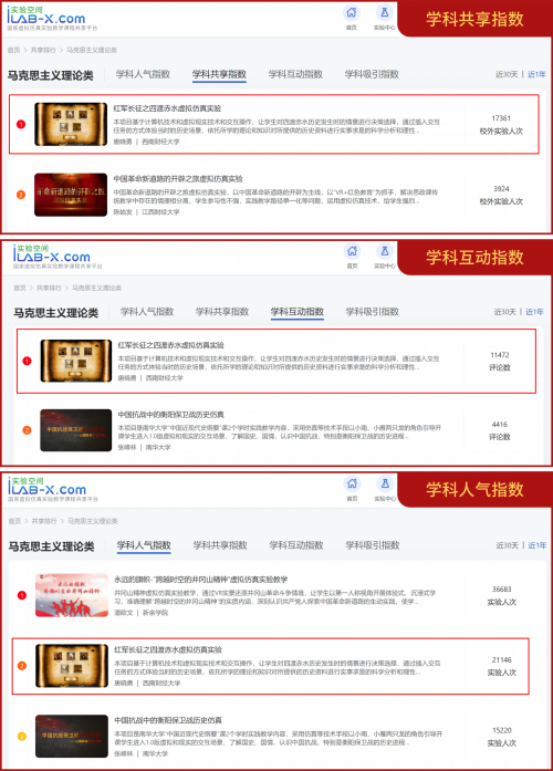 在实验空间马克思主义理论类课程2022年度榜单中,“红军长征之四渡赤水虚拟仿真实验”在“学科共享指数”“学科互动指数”榜单上断层名列第一,在“学科人气指数”榜单上名列第二,四项榜单中三项名列前茅,课程影响力和学生喜爱程度可见一斑。