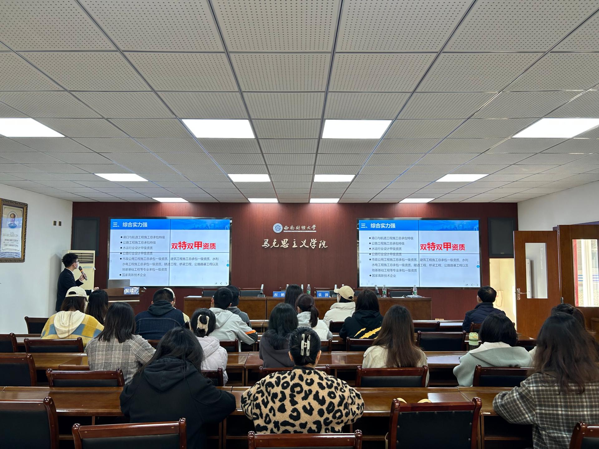 随后,中交四航局第六工程有限公司进行了专场宣讲,详细介绍了中交四航六局的企业建制、人才队伍、培训体系、工作环境、招聘要求等情况,并和参会同学进行了充分交流,从企业党政工作岗位需求出发,鼓励同学们深厚理论修养、扎实文字功底,提高从事大型国企党政工作的专业胜任力。宣讲结束后,公司与有就职意向的应届毕业生同学开展现场交流面谈、进行专场招聘,学院20余名毕业生线上线下投递简历。